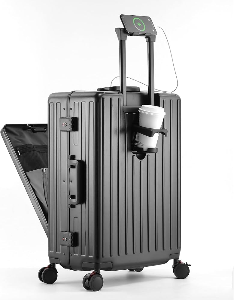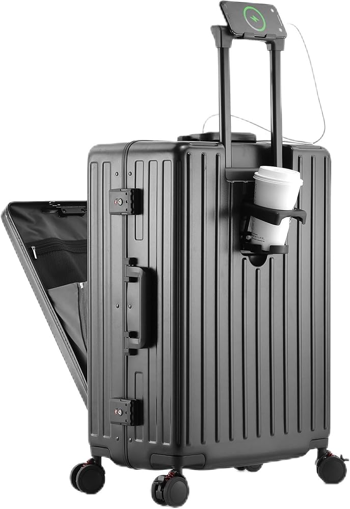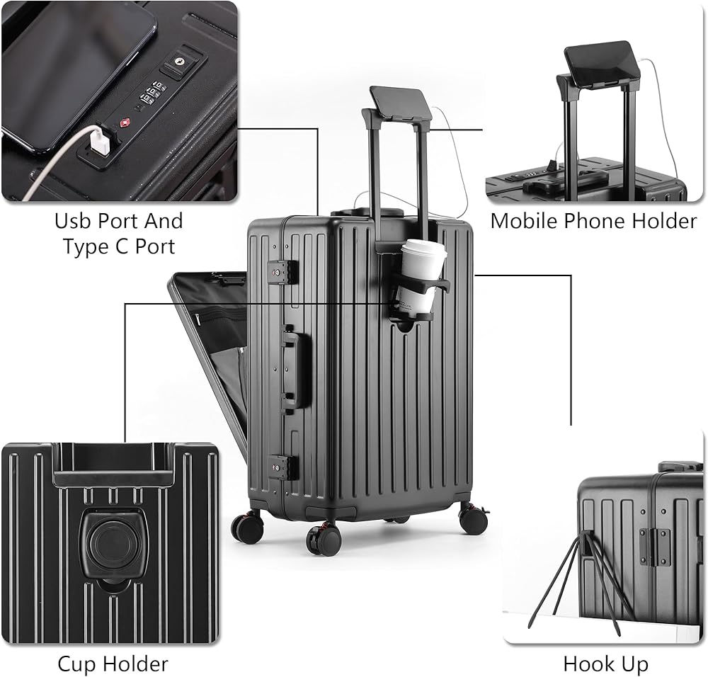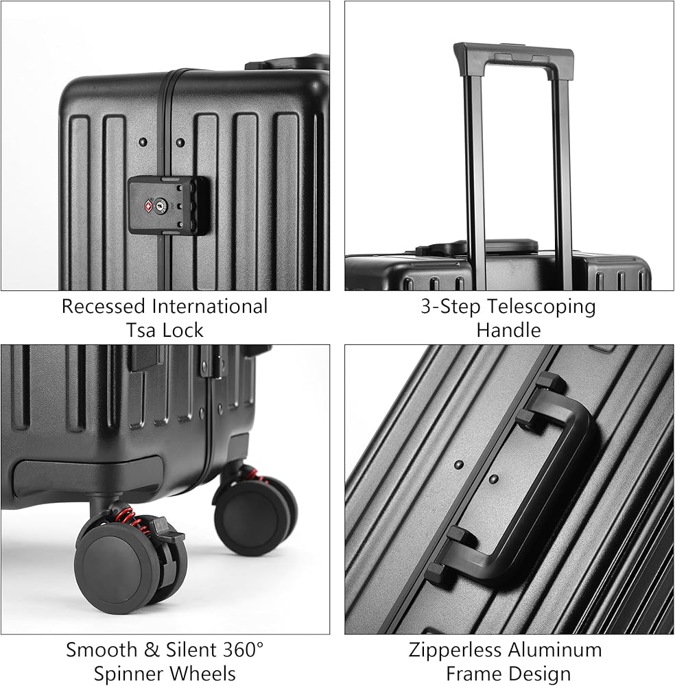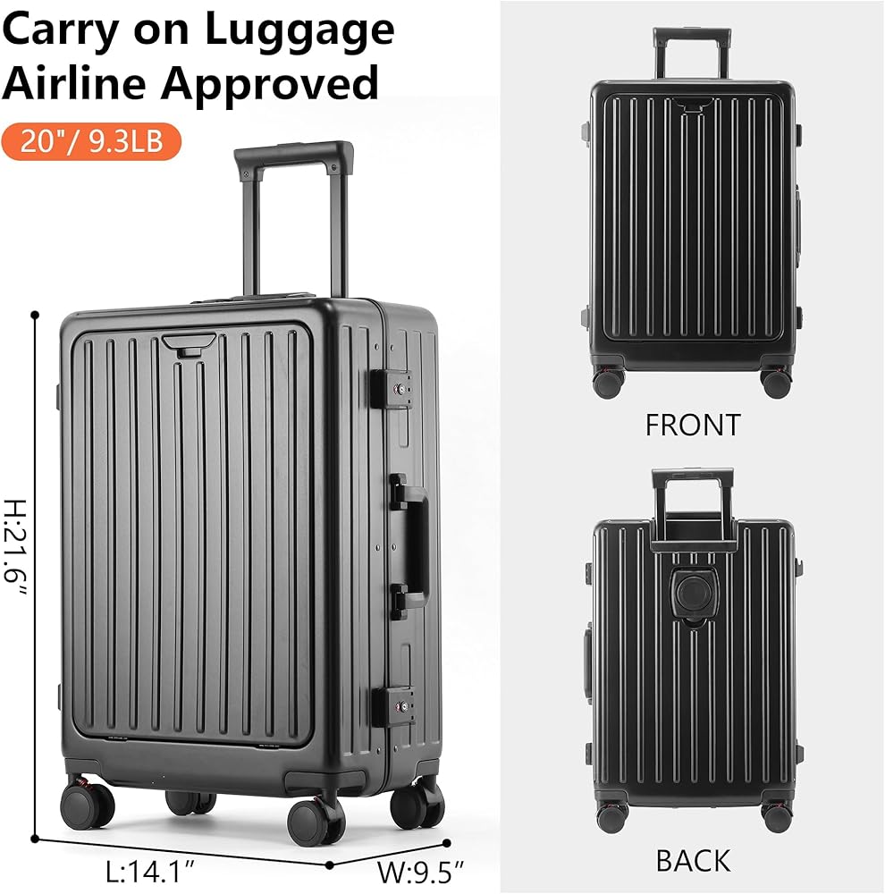 حمل الأمتعة مقاس 22 × 14 × 9 معتمدة من شركة الطيران، حقيبة صلبة خفيفة الوزن من الكمبيوتر الشخصي مع عجلات دوارة، وجيب أمامي، ومنفذ USB، وحامل أكواب وإطار من الألومنيوم، أسود، 20 بوصة