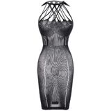 This sexy fishnet mesh bodystocking featuring black mesh and sheer striped bodystocking with spaghetti straps and an open crotch.