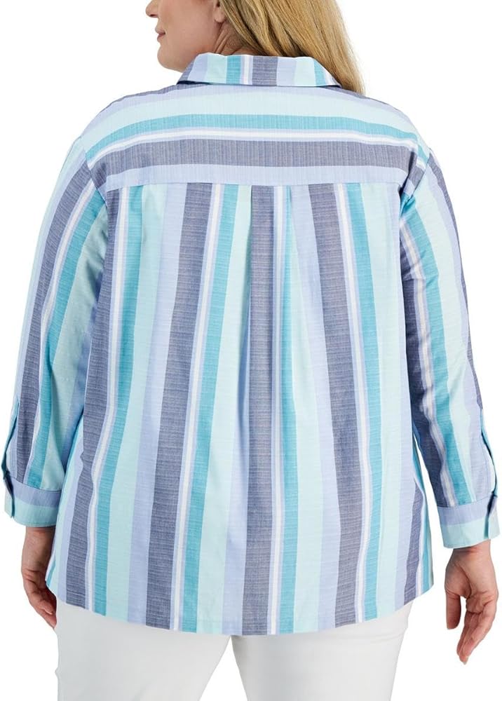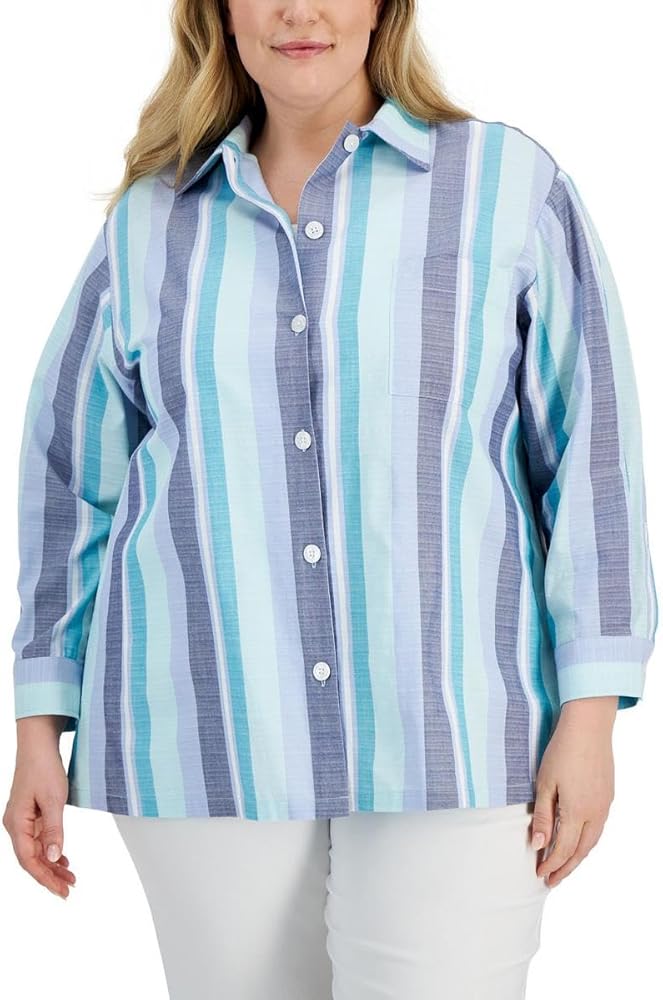 قميص Anne Klein النسائي ذو الياقات الكبيرة والمخطط بأزرار سفلية