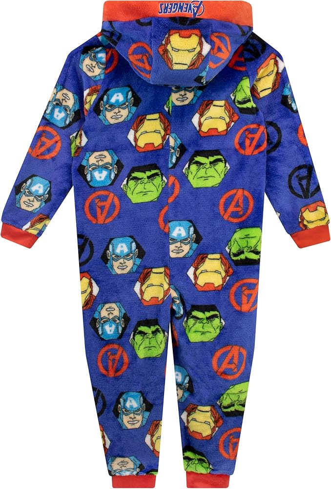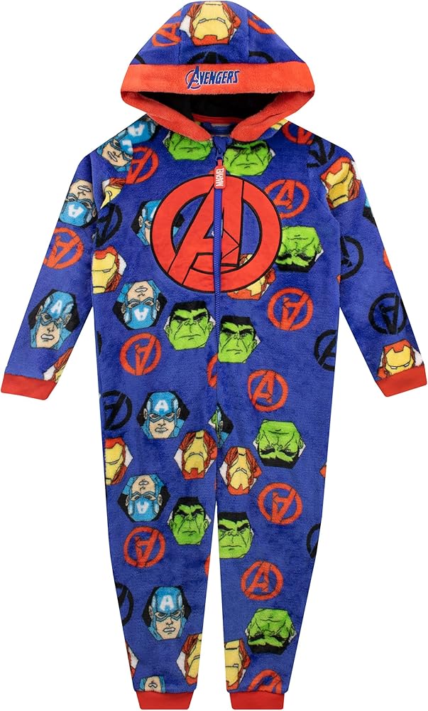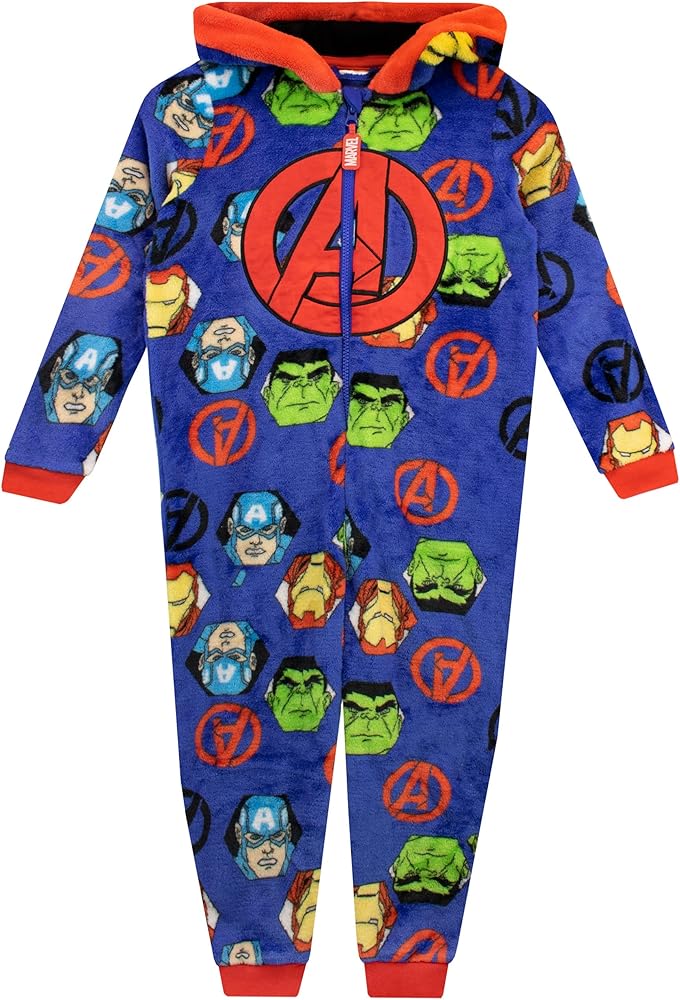 Boys Avengers Onesie. Your little Avenger-in-training can join his heroes for adventures in dreamland when he goes to bed in this super soft Avengers onesie! This blue all-in-one features a pattern of Hulk, Captain America and Iron Man with a large print of the Avengers' 'A' symbol, a Marvel zip pull and 'Avengers' embroidered on the hood. The simply zip fastening makes suiting up for battle easier than ever! Avengers…ASSEMBLE!