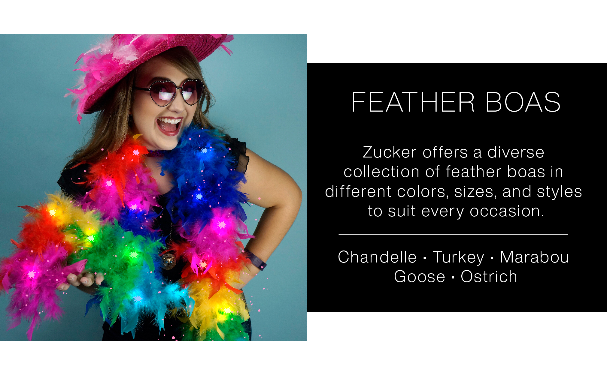• Zucker Feather Products has been in business since 1872. We sell cruelty free feather products for Craft & Costume, Fashion & Jewelry Design, Bridal & Lingerie, Millinery, Holiday & Decor, Television, Film, Theater, and more! We strive to be a step ahead of competition in quality, pricing, customer service, and product options