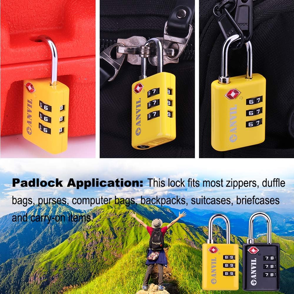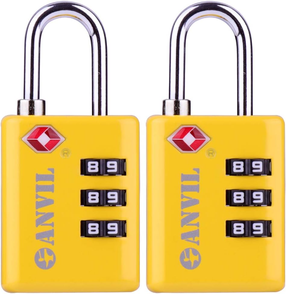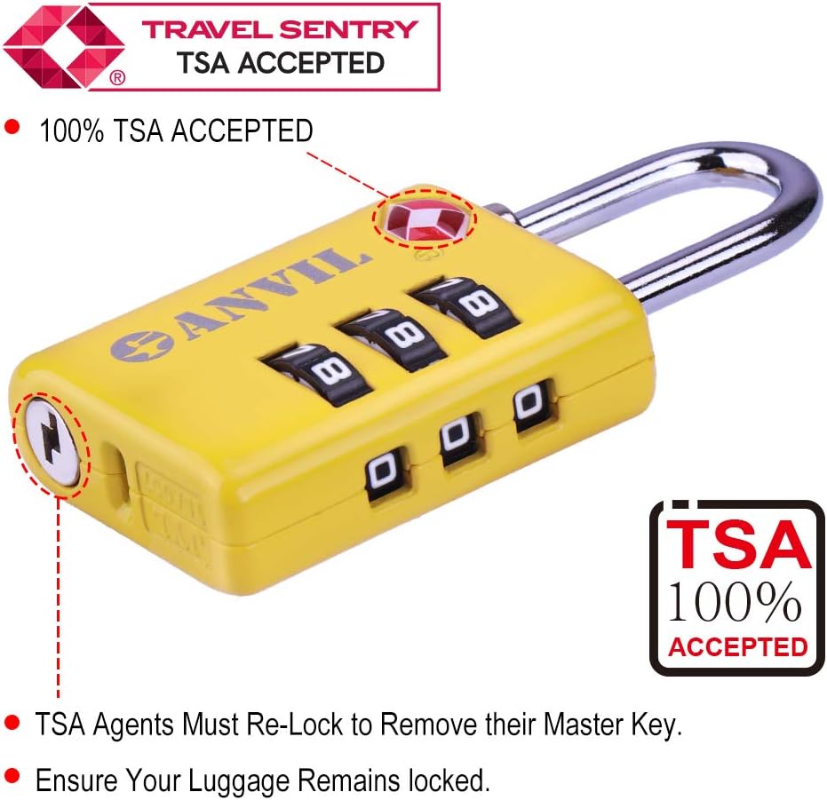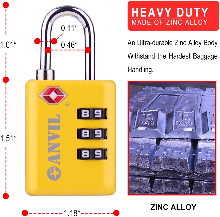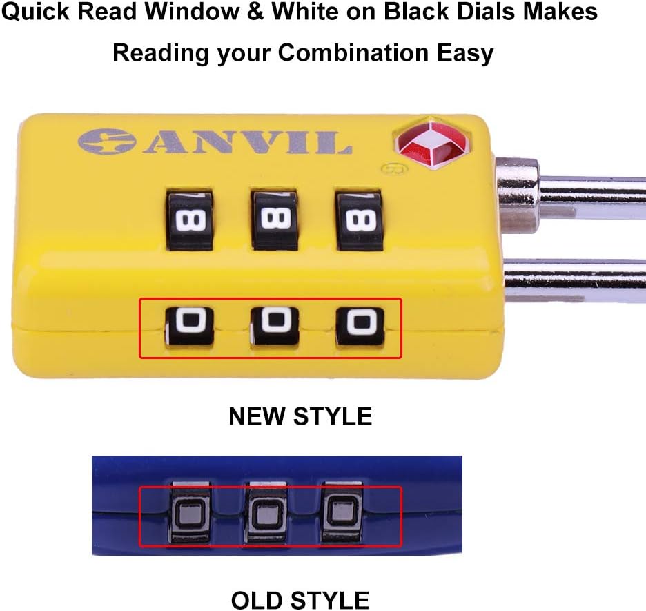 • ☸ READ YOUR COMBINATION WITHOUT THE EYE-STRAIN: Our white numeral on black background dials are easy to read in any lighting conditions.  Most TSA locks use chrome dials which reflect the fluorescent lighting found in most airports making them difficult to read.  With Anvil locks you don't need to squint or dig out reading glasses to enter the correct combination.