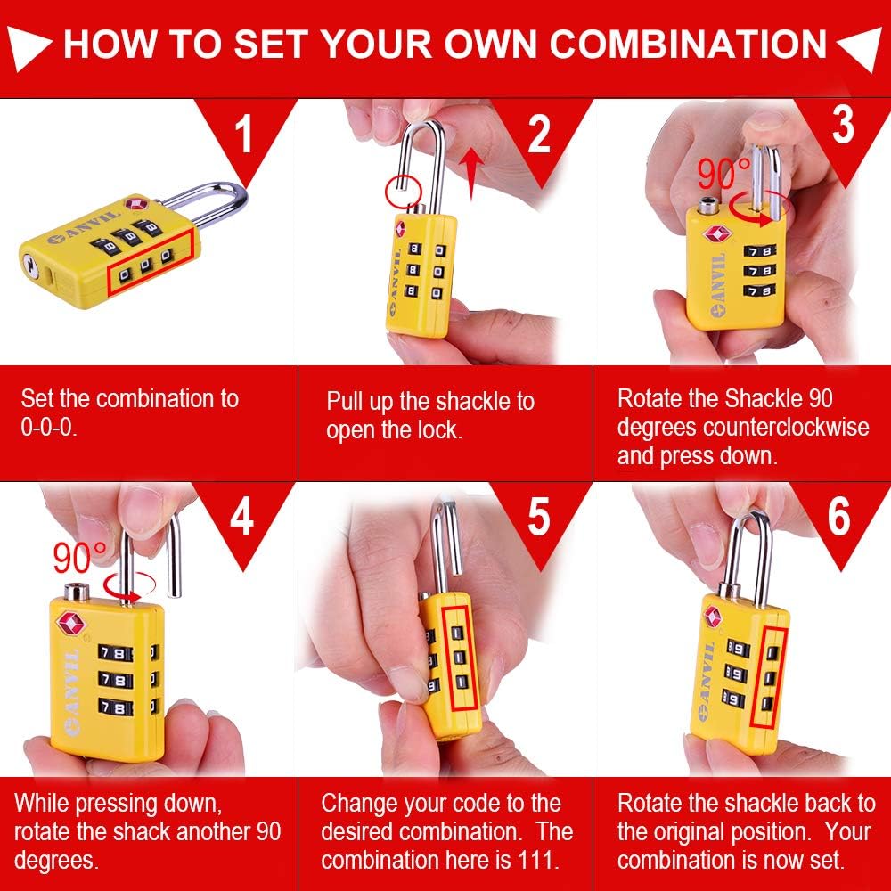 • ☸ 30 SECONDS TO SET YOUR COMBINATION – Anvil's easy set technology allows users to change the combination on their luggage locks in 30 seconds or less without any tools.  Our TSA locks come with step by step picture instructions and links to online instruction videos.  Lock owners can also change their combinations as many times as they desire.