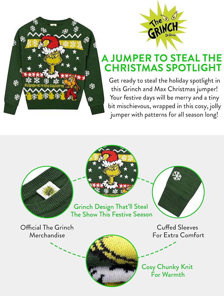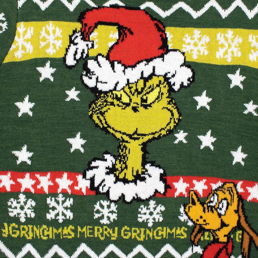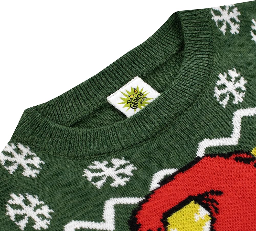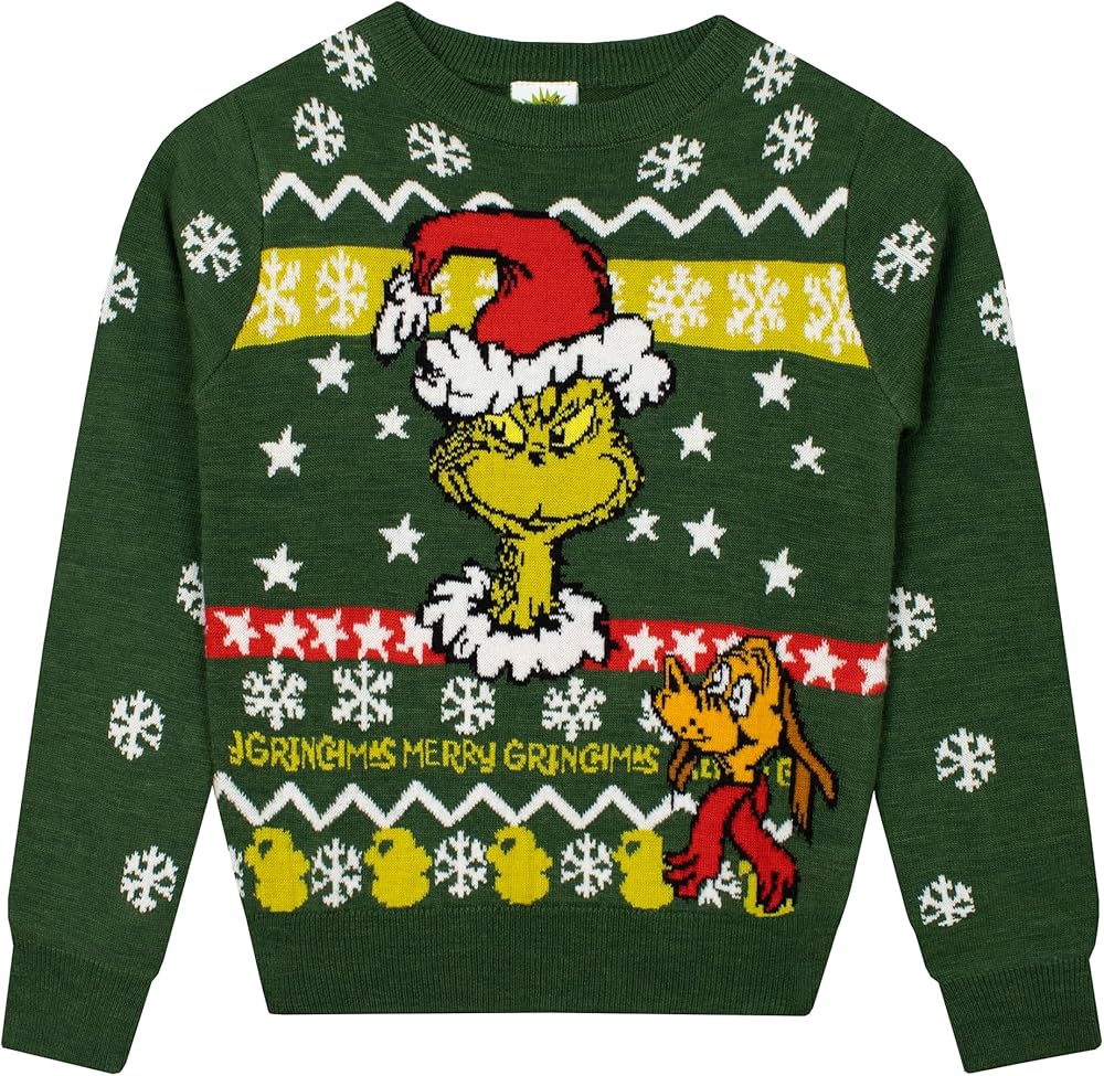 Usher in a tide of giggles, winks, and pure Christmas joy with our enchanting The Grinch Christmas sweater, a vibrant celebration woven into every thread! Revel in the tree-green hue, where the iconic Grinch, adorned with a Santa hat, and his adorable dog Max become the stars of your little one's festive adventures. But oh, the merry-making doesn't stop there! Behind our jolly characters, a sea of stars, gentle snowflakes, and the playful proclamation "Merry Ginchmas" set the stage for an enchanting holiday spectacle. Every sleeve is a journey through a snowy expanse, with white snowflakes sprinkled in a charming all-over print, whispering tales of winter wonderlands and festive frolics. Crafted to caress with warmth on chilly winter days, this isn't merely a grinch sweatshirt; it's a passport to a realm where every day is a playful mingle of Grinchy antics and heartfelt Christmas cheer. Specifically designed to elevate boys Christmas outfits, this piece ensures your little mischief-maker is bundled in cozy tales of Whoville's most infamous resident. The versatility stretches beyond a mere piece of the grinch merchandise; it's a heart, a memory, and a story wrapped into a soft, cozy ensemble, designed to enchant and become a beloved staple in any child's festive wardrobe. Whether seeking the pinnacle of boys sweaters, exploring gifts for boys, or hunting for that perfect Christmas themed birthday gift, our grinch sweater promises not just a garment but a gift box of laughter and a sprinkling of holiday magic. So, invite the Grinch, Max, and a whirlwind of merry “Ginchmas” pranks into your celebrations. Wrap your little ones in stories, warmth, and a little sprinkle of Grinchy charm, ensuring that their holidays are forever interwoven with tales from the heart of Whoville. Let every thread whisper tales of mischief and the true spirit of Christmas, with our Grinch Christmas sweater. Here's to giggles, winks, and a whole lot of heart-grown-three-sizes moments!
