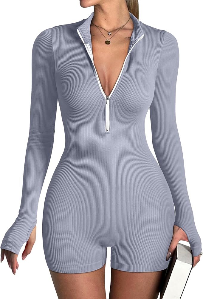 Sexy Ribbed Zip Front Long Sleeve Rompers, flattering fashion zip design, long sleeve, shorts, simple in design,don't see through, Best womens, ladies and teen girl clothes.