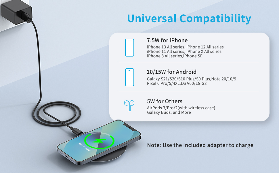 【شحن سريع بحد أقصى 15 وات】أقصى طاقة إخراج للشاحن اللاسلكي السريع هي 15 وات. متوافق مع الأجهزة التي تدعم تقنية Qi، مثل iPhone 14/14 Plus/14 Pro/14 Pro Max/13/13 mini/13 Pro/13 Pro Max/12/12 mini/12 Pro/12 Pro Max/11/11 Pro/11 Pro Max/XS Max/XR/XS/X/8/8 Plus/SE/AirPods 3/Pro/AirPods 2 [الطراز اللاسلكي فقط]؛ سامسونج جالاكسي S21/S20/S20+/S10/S10+/S10E/S9/S9+/S8/S8+; جالاكسي نوت 20/20+/10/10+؛ Google Pixel 7 Pro/6/5/4XL/4 والهواتف الأخرى التي تدعم تقنية Qi مثل LG/OnePlus/Motorala/Realme، إلخ.