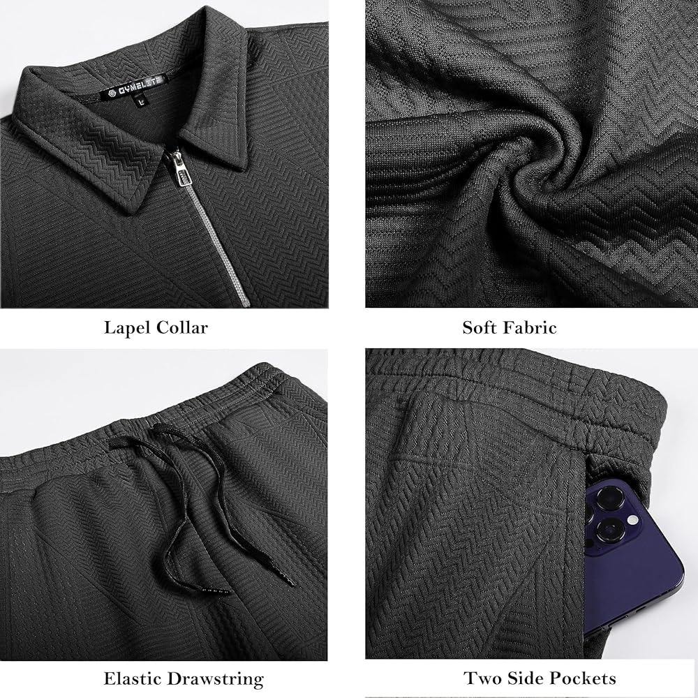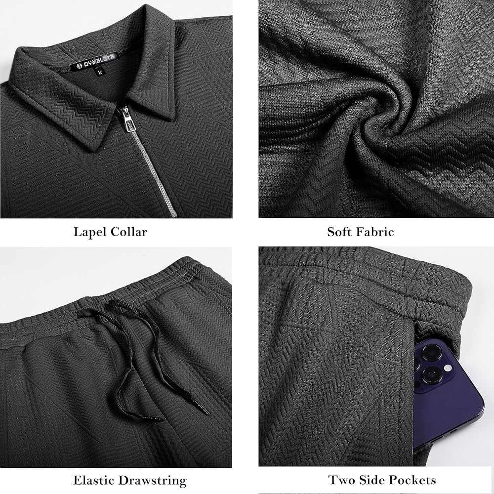 【تصميم ذكي】بدلة رياضية للرجال مكونة من قطعتين مع ياقة واقفة، وسحاب أمامي قابل للتعديل 1/4، ولون كلاسيكي لا يتأثر بمرور الزمن، وفتحة جانبية وحاشية منحنية مع ضمان مظهرك الأنيق وحرية الحركة.