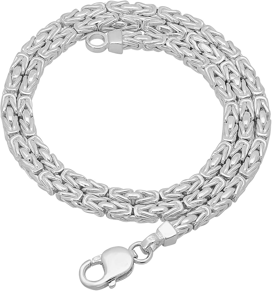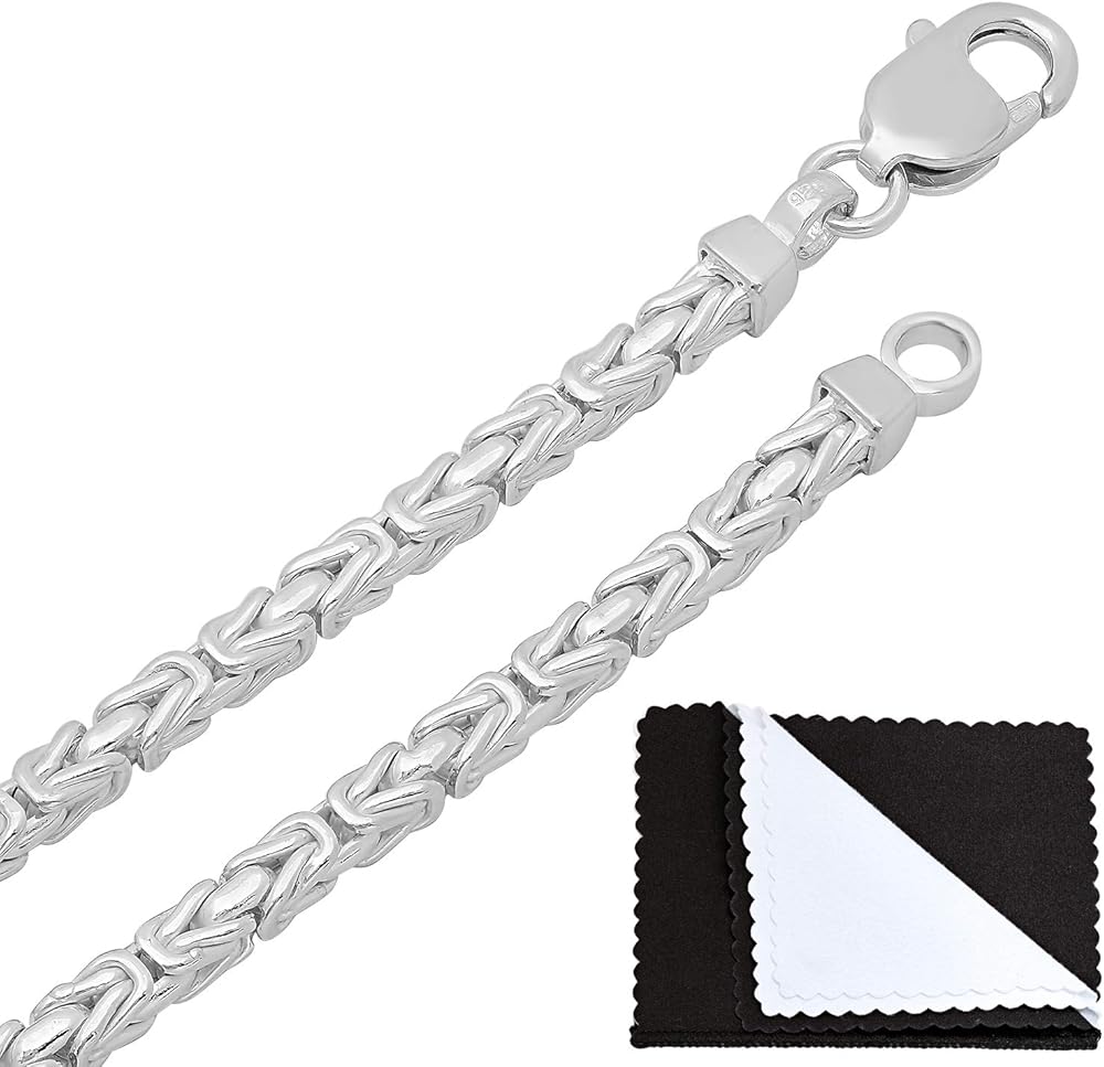 This pure & authentic nickel-free .925 sterling silver 4.1mm thick boxed Byzantine chain necklace is made in Italy with superior craftsmanship. This chain is a true classic that will make an excellent gift for males of all ages & sizes (boys, teens, and men) or women who are looking for the the look of a bold chain. The chain is secured with a sturdy lobster clasp and offered in a variety of lengths allowing you to personalize to your desired fit (please refer to size reference chart photo to help you make your selection). Each chain ships with a lifetime warranty & authenticity guarantee card as well as a microfiber jewelry polishing cloth to help clean, shine, and protect your sterling silver jewelry.