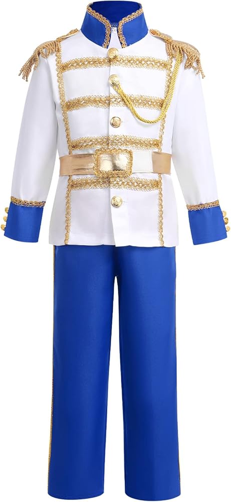 ✤✤ أزياء الأمير للأطفال: زي الأمير الملكي للأطفال، زي الأمير الملكي، سترة مطرزة بالذهب بأكمام طويلة، مطابقة مع زوج من السراويل الطويلة. يأتي مع حزام يتم ارتداؤه فوق السترة، مما يجعل طفلك أكثر وسامة ورائعة. بالإضافة إلى إكسسوارات زي الملك الملكي والصولجان الملكي. التصميم الإبداعي سيجلب أميرك إلى عالم لعب الأدوار الخيالي المضحك. سيشعر طفلك الصغير وكأنه ملك أو أمير ليوم واحد في هذه الأزياء التنكرية التي تعود للقرون الوسطى.