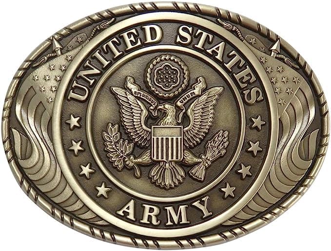 𝐀𝐑𝐌𝐘 𝐁𝐄𝐋𝐓 𝐁𝐔𝐂𝐊𝐋𝐄: US ARMY Crest framed by waving USA Flags. Solid Brass. A life time heirloom accessory to be cherished for generations and a great gift for any Active Duty or Retired Soldier.