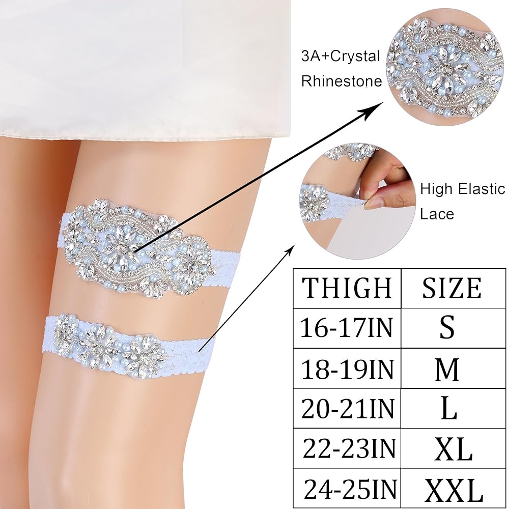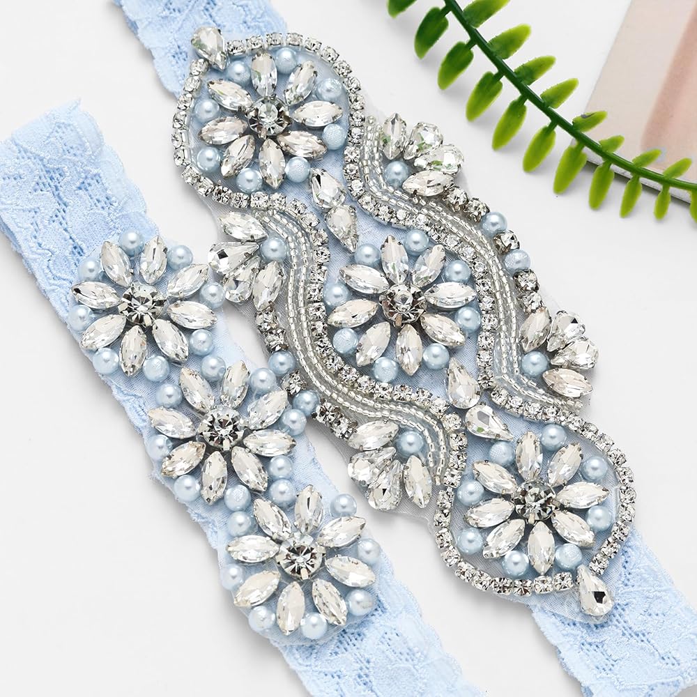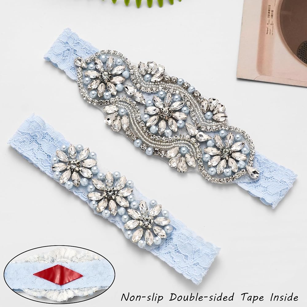 مجموعة من قطعتين: مرصع بشكل رائع بالكريستال واللؤلؤ المتلألئ، يضيف هذا الرباط الأزرق لمسة جميلة إلى إكسسوارات زفافك. تتميز مجموعة أربطة الزفاف هذه بمقبض مانع للانزلاق بحيث يبقى الرباط الخاص بك في مكانه ويتضمن نسخة مصغرة لرميها في مكتب الاستقبال.