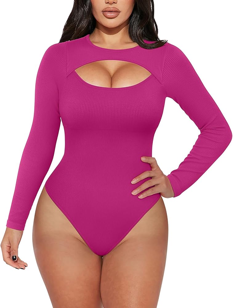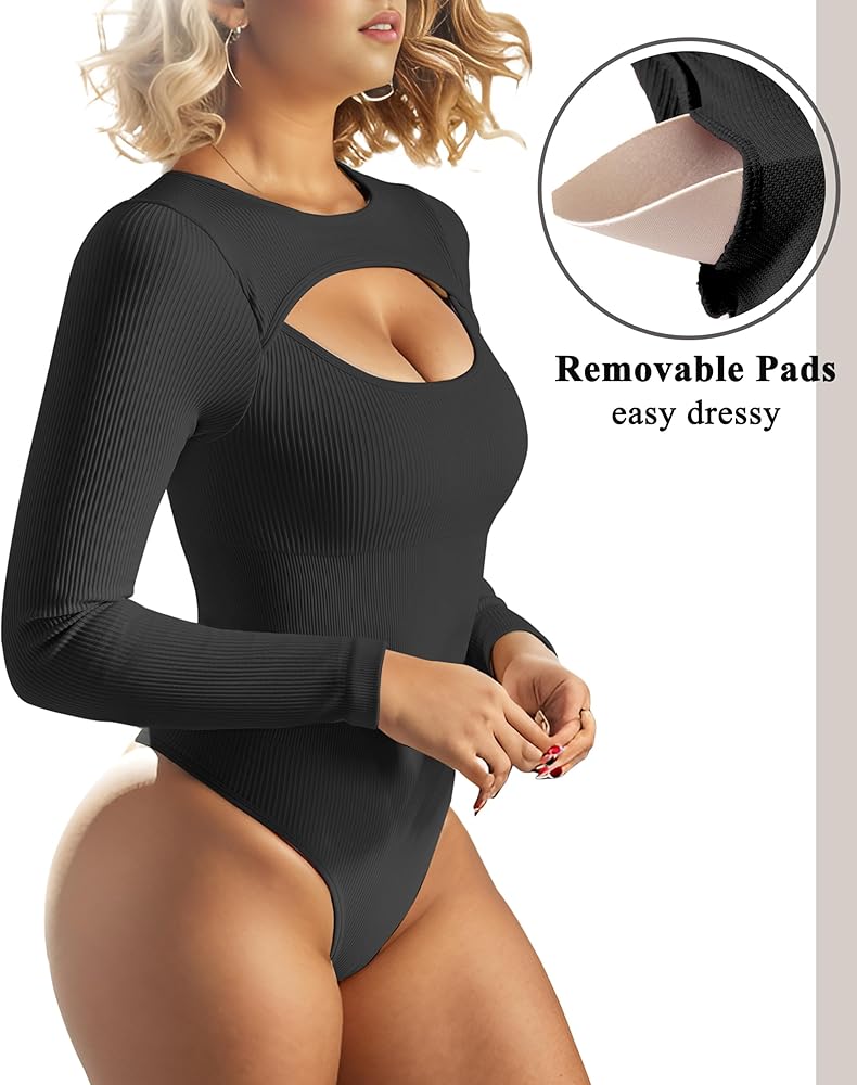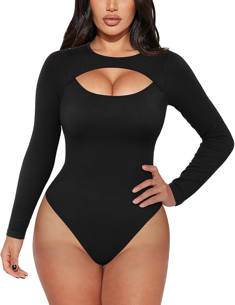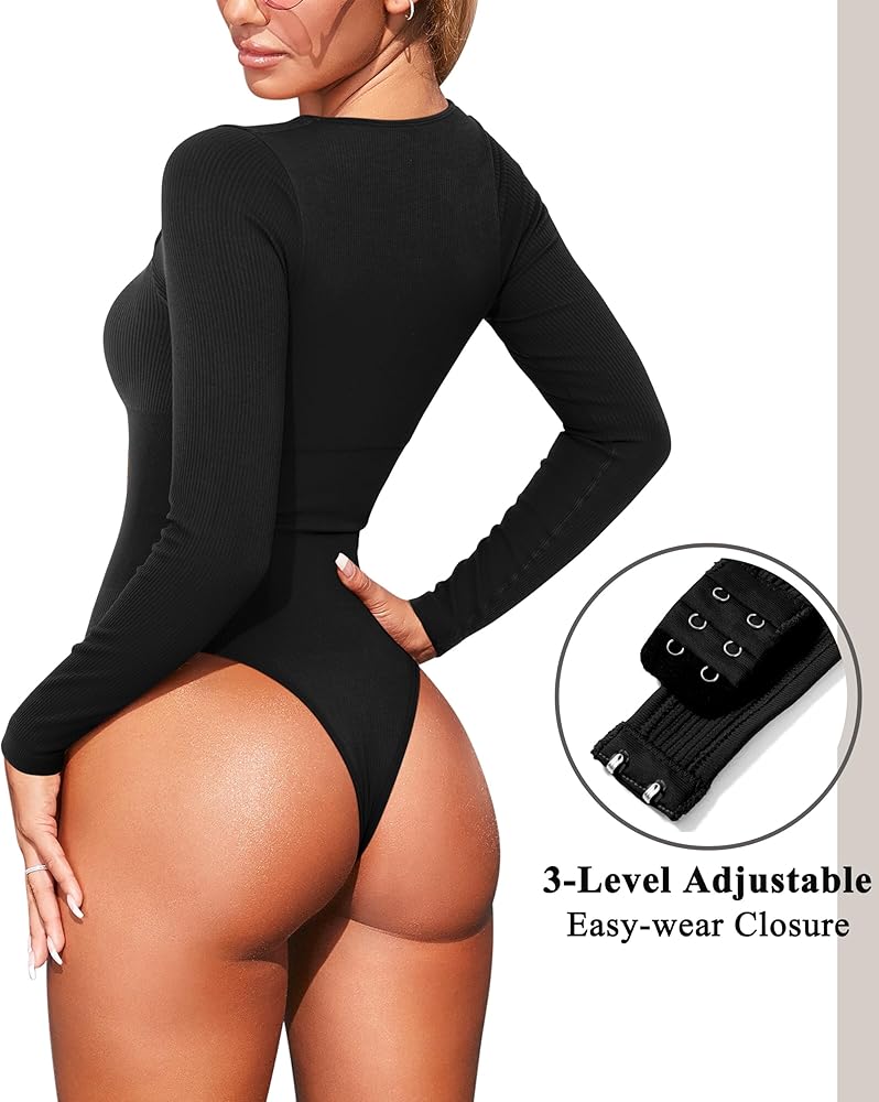 بدلة للجسم للسيدات طويلة الأكمام للتحكم في البطن، بدلة مضلعة، مصنوعة من نسيج محبوك مطاطي في 4 اتجاهات، ضغط متوسط، ليست ضيقة جدًا، بدلة للجسم ناعمة زبدية، سميكة بما فيه الكفاية، لا يمكن الرؤية من خلالها.
