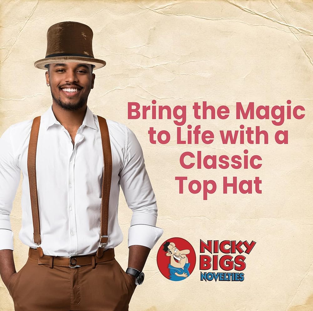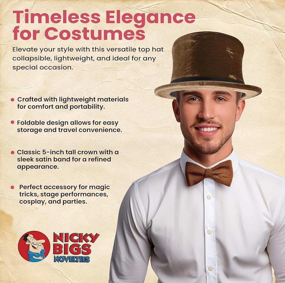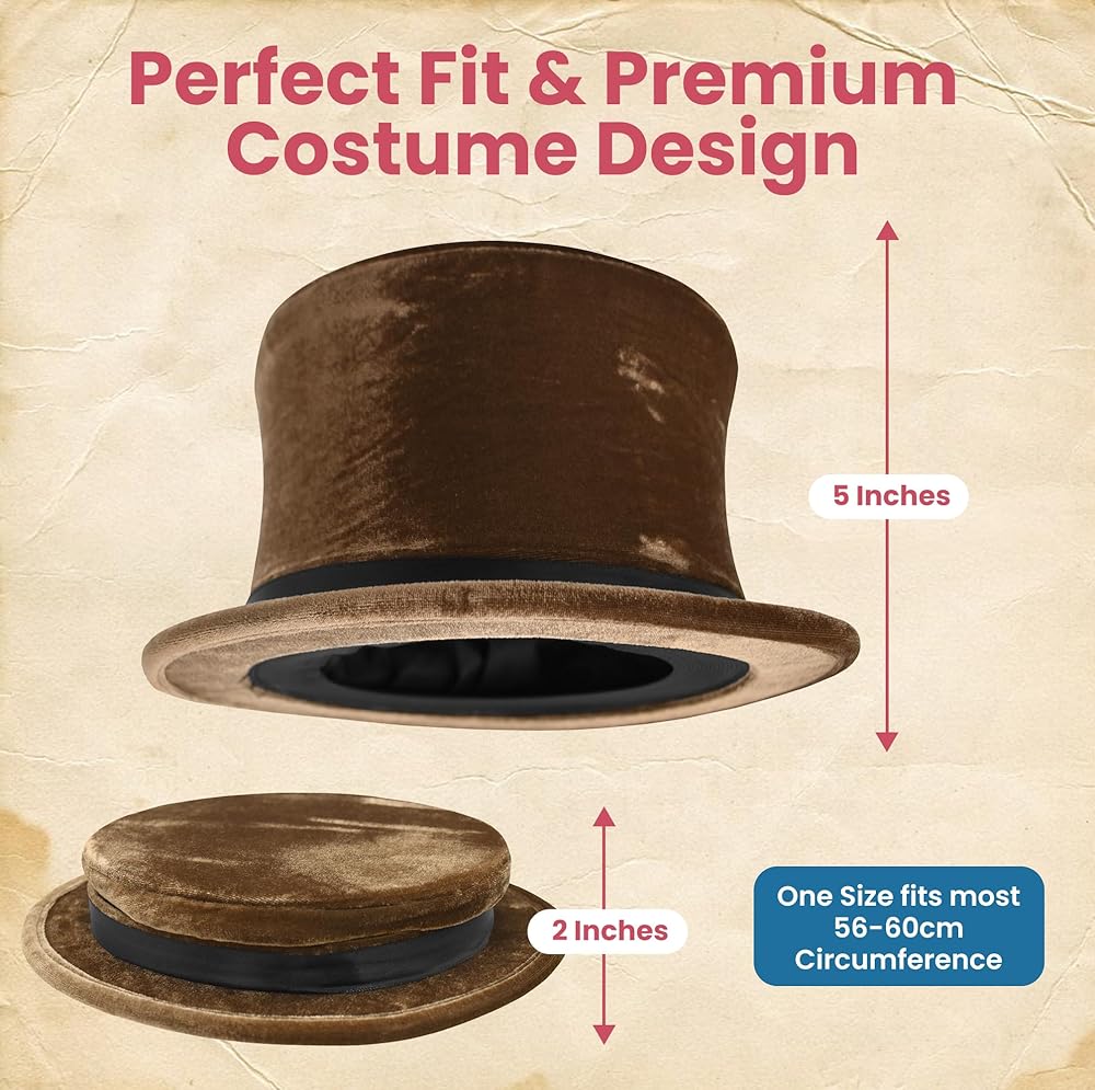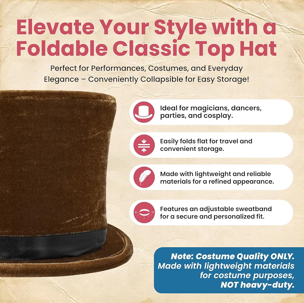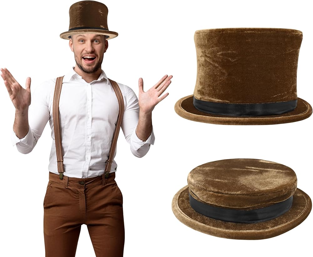 Looking to complete your Magician costume? A wizard of any sense can't be without their hat! Grab one of these Pop Up collapsible hats and take your outfit to the next level. Select from a Black velvet Top Hat or a Brown velvet Top Hat. Both feature easy to use collapsible mechanism inside to allow the hat to go up and down with ease. Perfect for doing magic tricks with all ages! With the traditional black color of most magicians, try out our brown collapsable hat for a steampunk twist! Each hat stands about 5 inches tall and collapses down to 2 inches. Brim is about 1.5in wide. Including a sweatband for comfortable and customized fit, each hat fits approximately 56cm to 60cm. Great for Men, Women and Teens! When tophat is collapsed it is easy to store. Great for Halloween, Cosplay, Theater, and more! For ages 14 and older.
