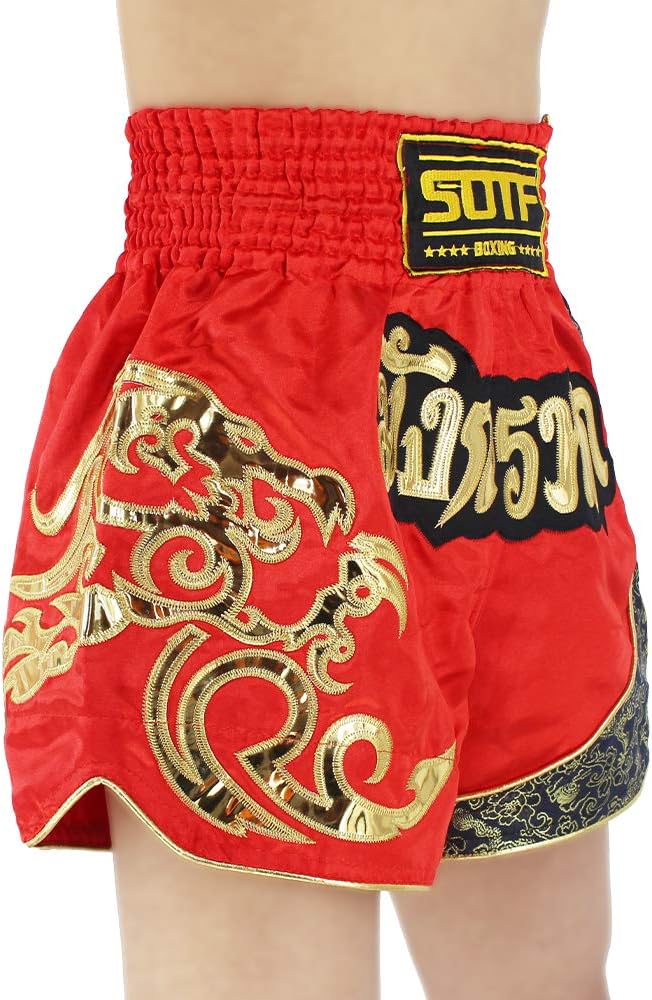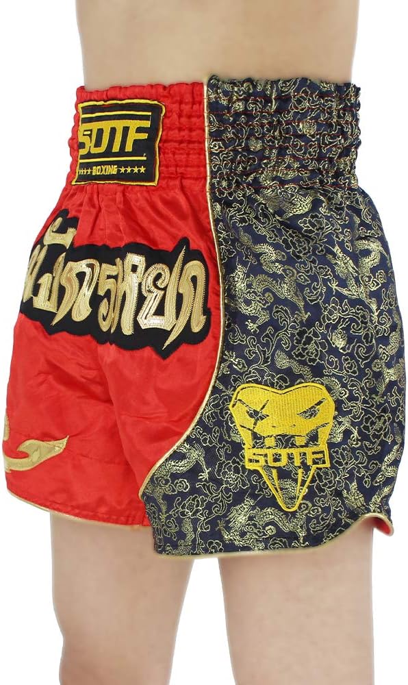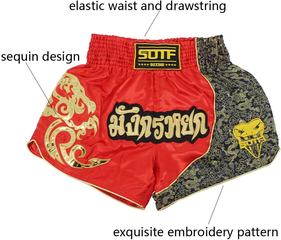 • 2. SOTF muay thai shorts use exquisite embroidery pattern and sequin design. Kick boxing shorts no color fading after washing.