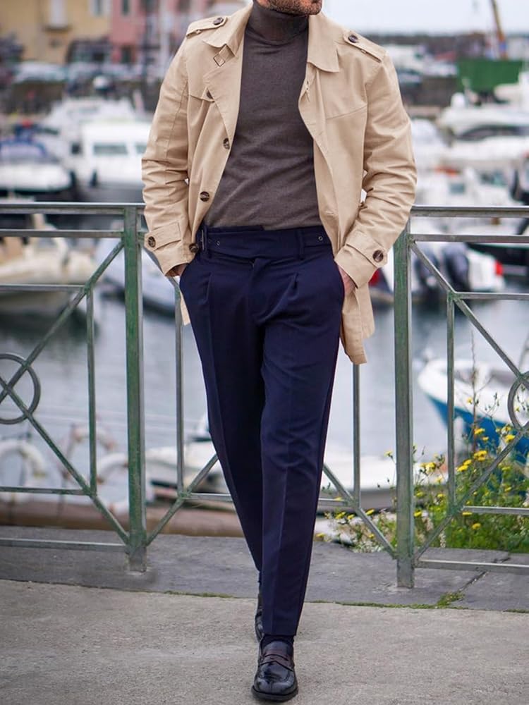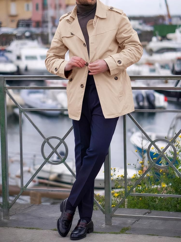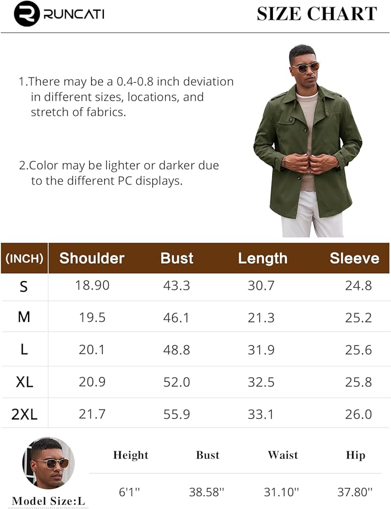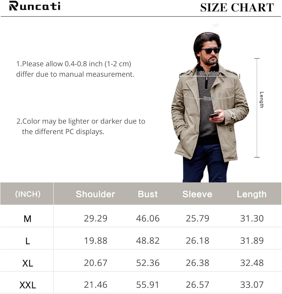 الميزات: معطف الخندق هو قطعة أزياء خالدة يجب أن يمتلكها كل رجل. معطف Runcati الكلاسيكي للرجال في الهواء الطلق ذو صدر واحد بتصميم بسيط، متوسط الطول، طية صدر مشقوقة، نحيف مريح، مناسب للارتداء اليومي. التصميم التفصيلي للجيوب الجانبية والمبطنة يجعل من السهل حمل الأشياء الثمينة مثل الهواتف المحمولة والمفاتيح، الخ ودفئ يديك.