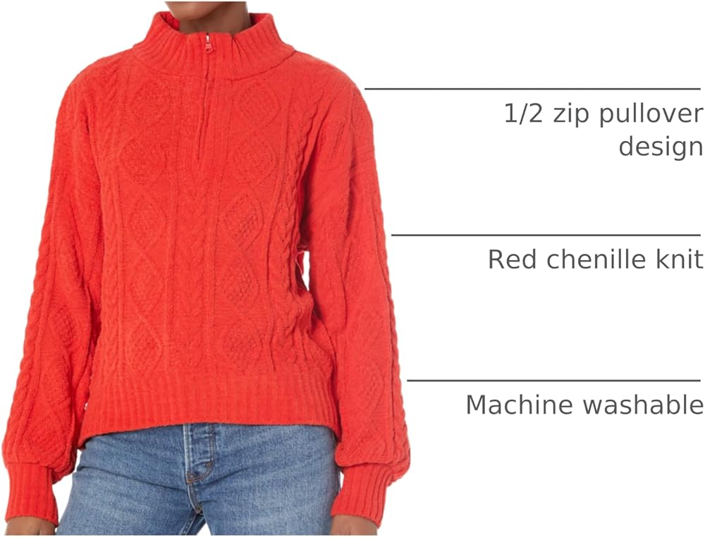 - 1/2 zip pullover with high neck, in red chenille knit cable pattern
