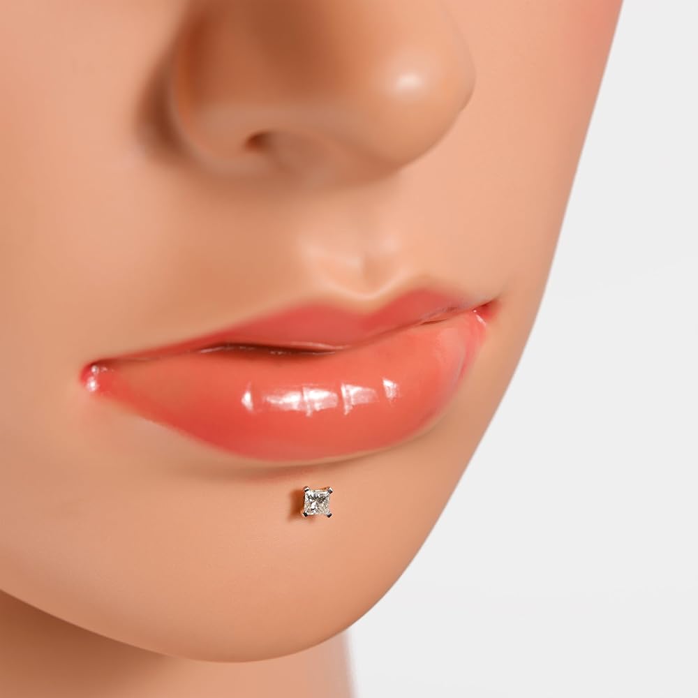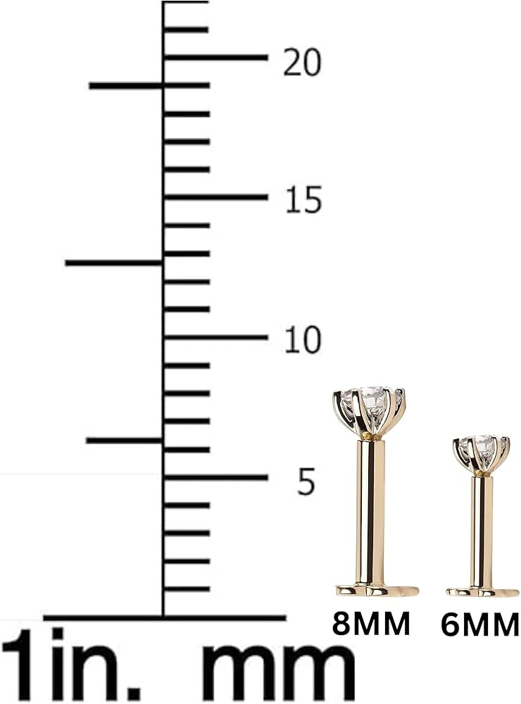الأبعاد - المقياس: 16 جرام (1.20 ملم) الطول الإجمالي: 8 ملم كما هو موضح في الصورة. مناسبة لثقوب الأنف اليسرى واليمنى، أو Lib Labret أو Mornoe Stud. مثالي للارتداء اليومي!