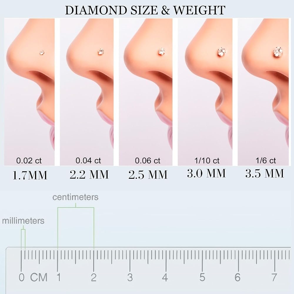 اختر مقاس الماس الخاص بك - خاتم الأنف هذا متوفر بأحجام مختلفة من الماس. صغير 0.04 قيراط - إذا كنت تبحث عن شيء أنيق مع لمسة من التألق على حلقة أنفك إلى مقاس 1/6 قيراط الكبير إذا كنت تريد أن تبرز حلقة أنفك. هناك شيء في جميع الأحجام.