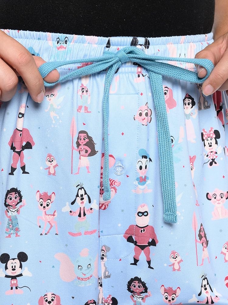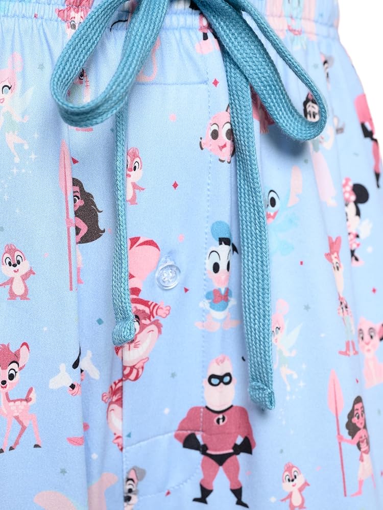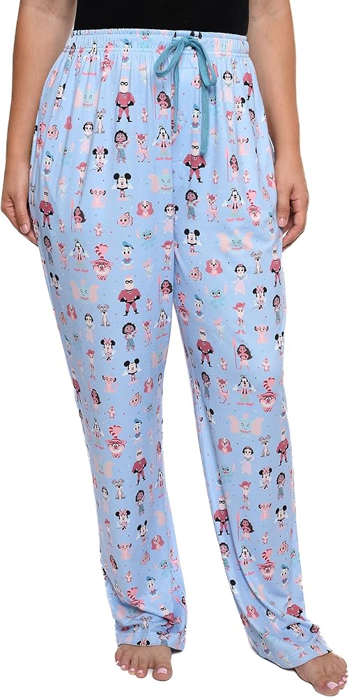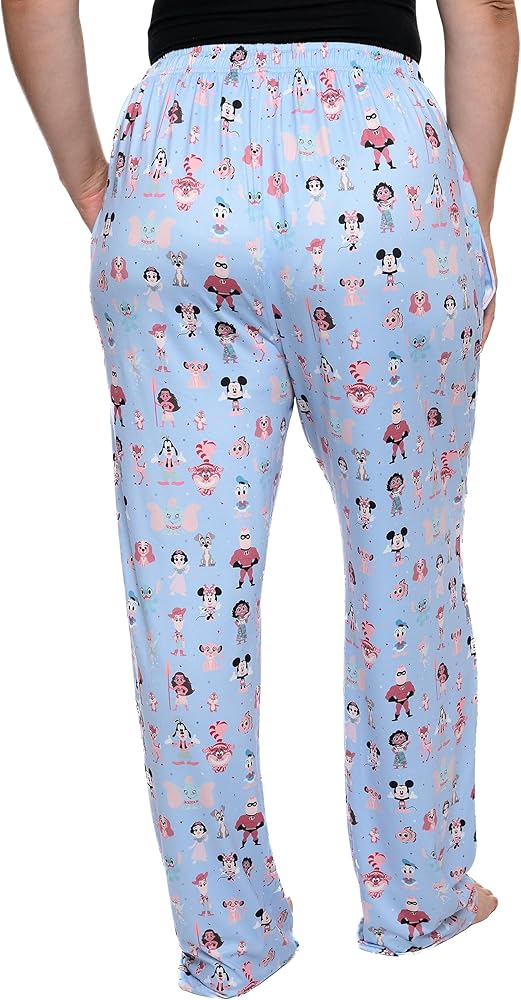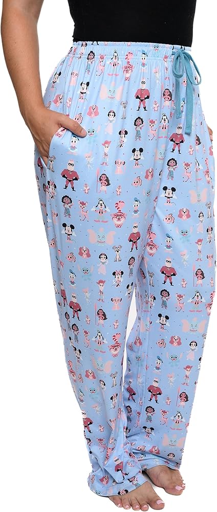 Disney 100 Women's lounge pants with all over prints - officially licensed. Characters include: Mickey Mouse, Minnie Mouse, Goofy, Donald Duck, Stitch, Dumbo, Lady, Tramp, Cheshire Cat, Snow White, Moana, Mirabel (Encanto), Nemo, Simba (Lion King), Tinkerbell, Bambi, Woody (Toy Story), Chip, Dale and Mr. Incredible. Lightweight fabric is polyester/spandex blend. They have an elastic waist with an adjustable drawstring. There are two side pockets and a button fly. Turn inside out to machine wash separately in cold on gentle; then tumble dry low.