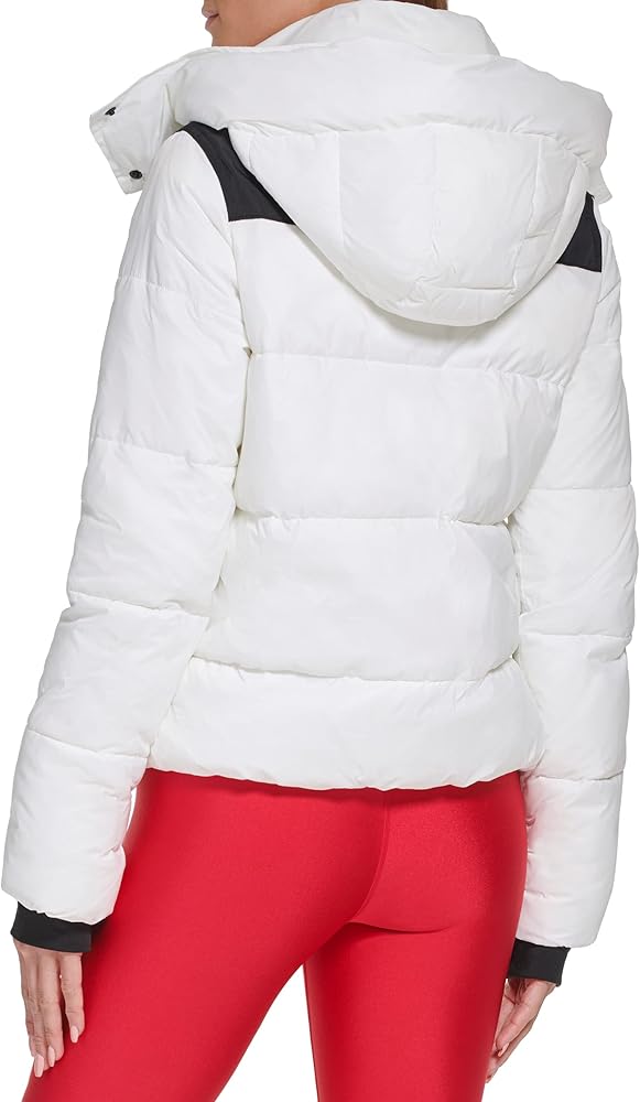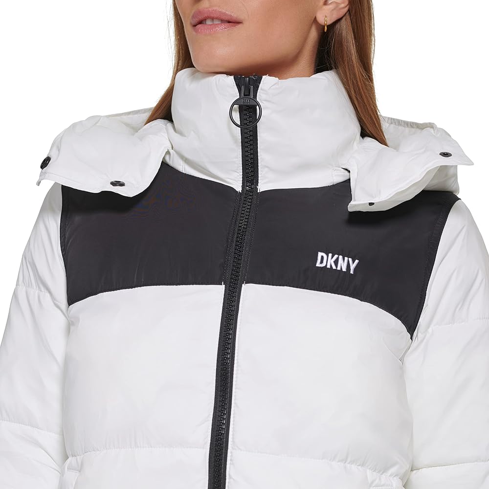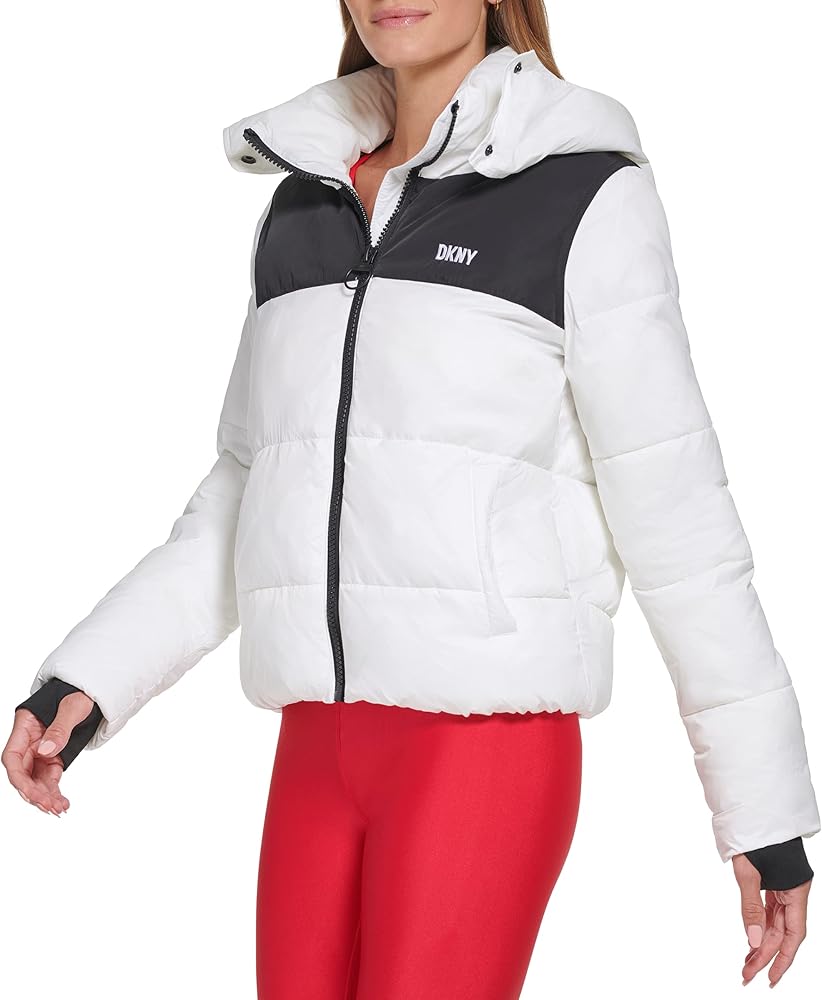 This DKNY Women's Sport JACKET is a colorblock logo puffer w/ removeable hood