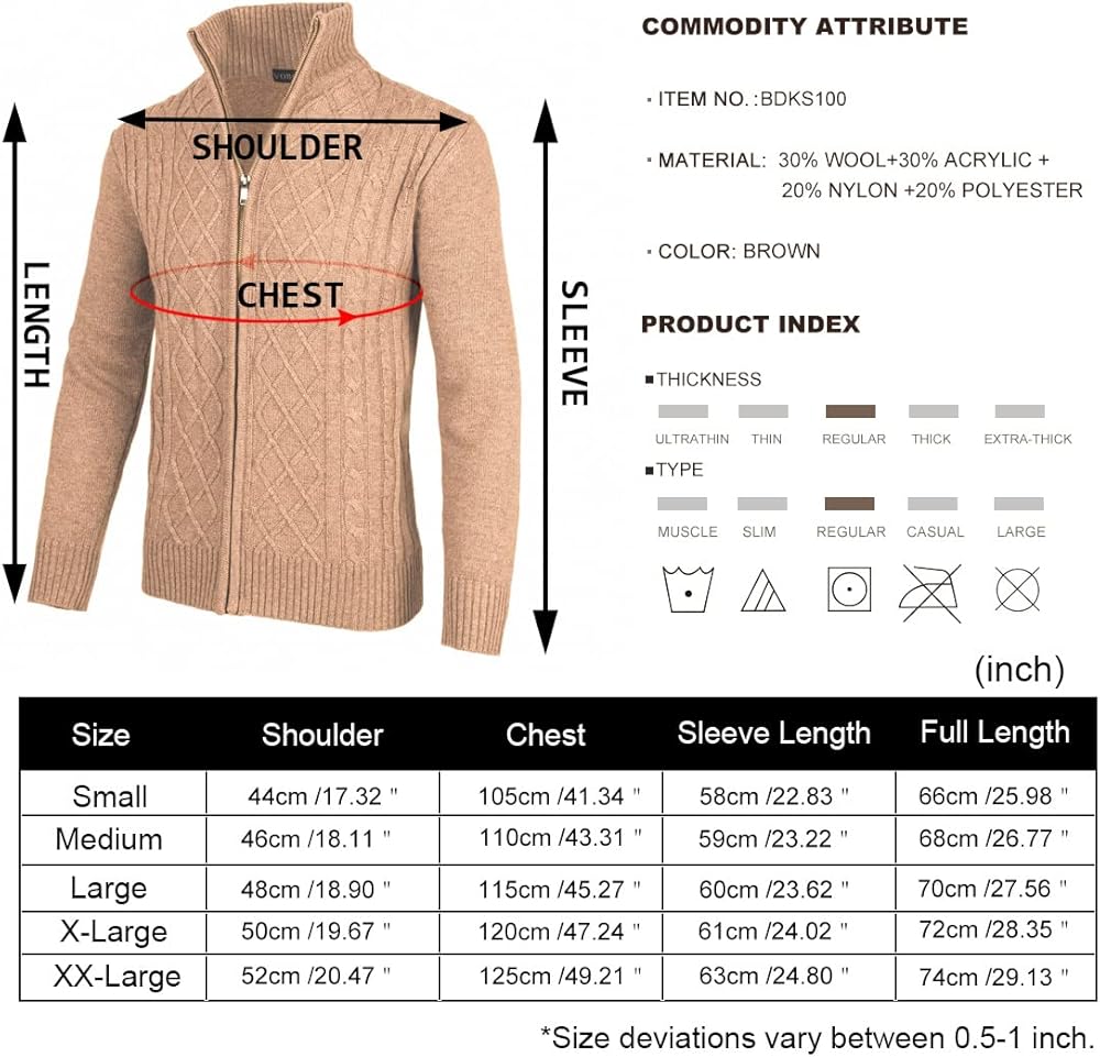 - المواد: 30% صوف، 30% أكريليك، 20% نايلون، 20% بوليستر؛ سترة سترة محبوكة بسحاب