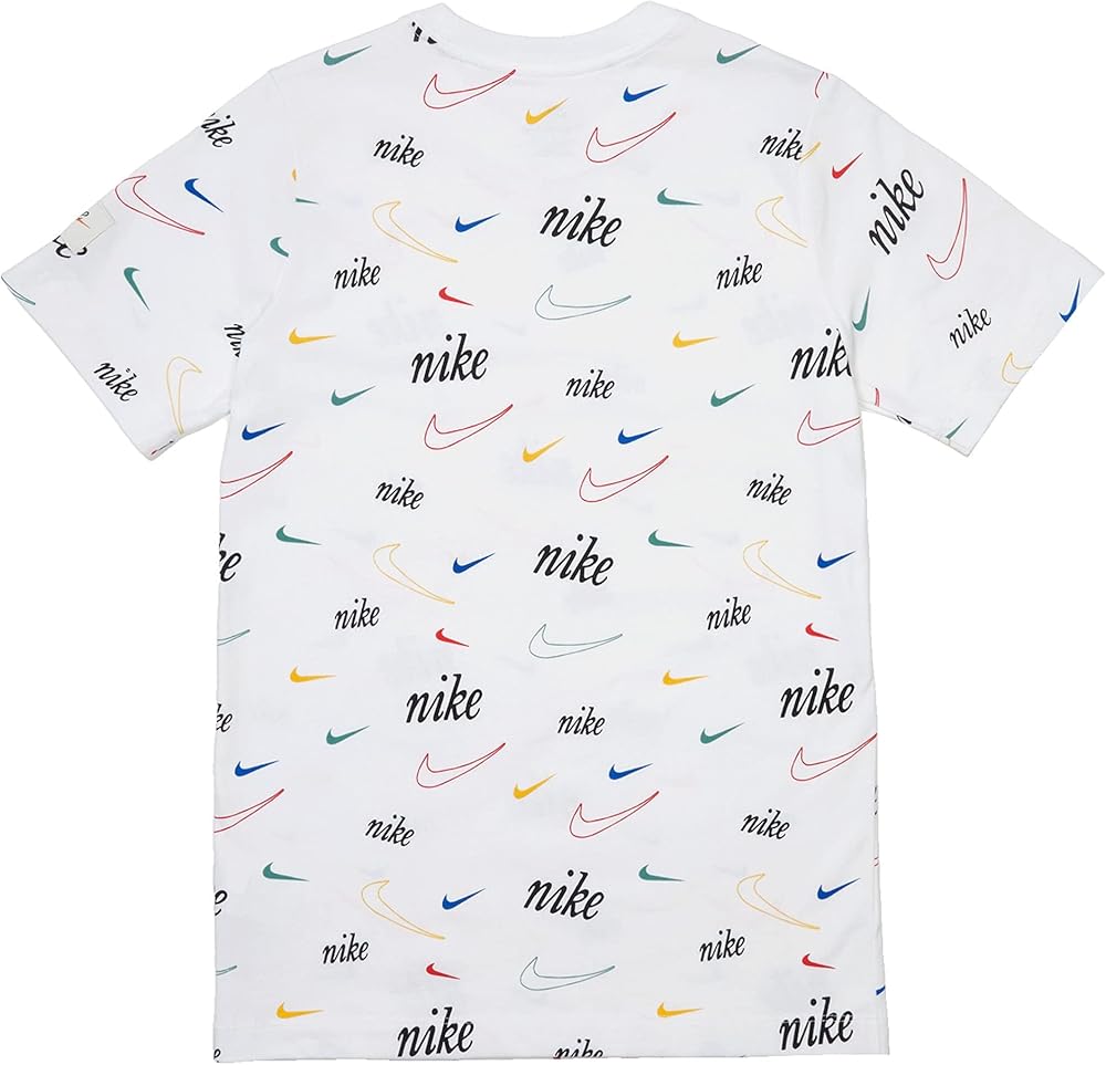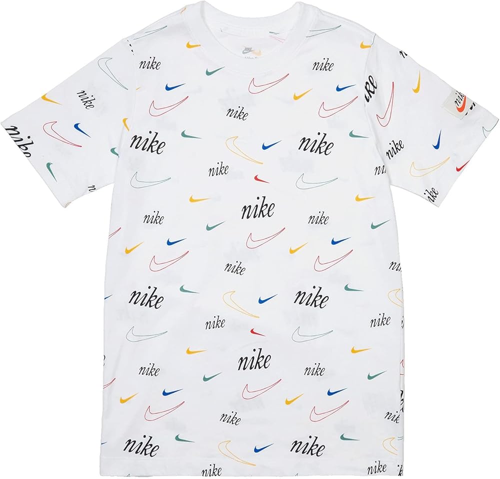 THE BIG 5-0 FOR THE SWOOSH.50+ years of the Swoosh! Awesome, right? The Nike Sportswear T-Shirt celebrates this milestone with a splash of logos and bright colors. Cotton fabric feels soft and lightweight. Ribbed crew neck stretches while you move. Standard fit for a relaxed, easy feel 100% cotton Machine wash Measurements: Length: 25 in Chest Measurement: 16 in Sleeve Length: 11 inProduct measurements were taken using size LG (14-16 Big Kids). Please note that measurements may vary by size.