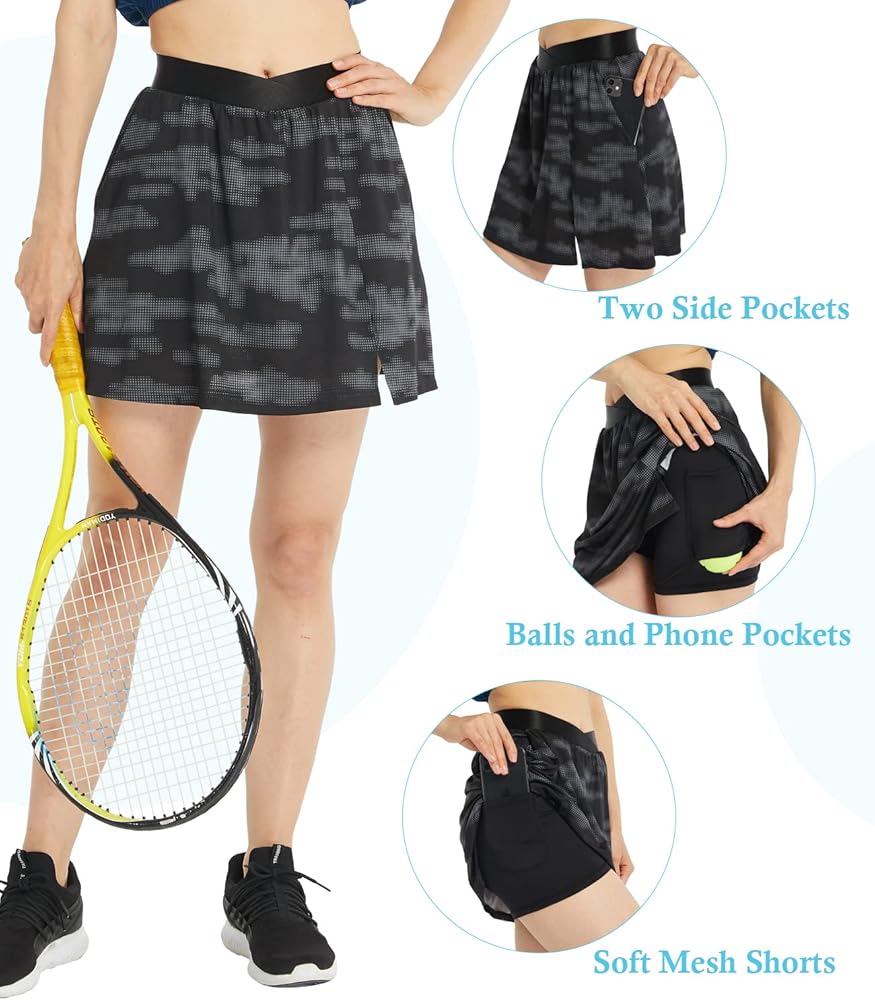 4 جيوب وجيب واحد مرفق: يمكن استخدام جيبين عمليين على التنورة لتخزين أشياء مثل البطاقات والنقود وأحمر الشفاه. الجيبان المخفيان على الشورت لهواتفك وجيب إضافي على جيب الهاتف يسمح لك بأخذ الكرة بيد واحدة، حرر يديك عند لعب التنس أو الجولف.