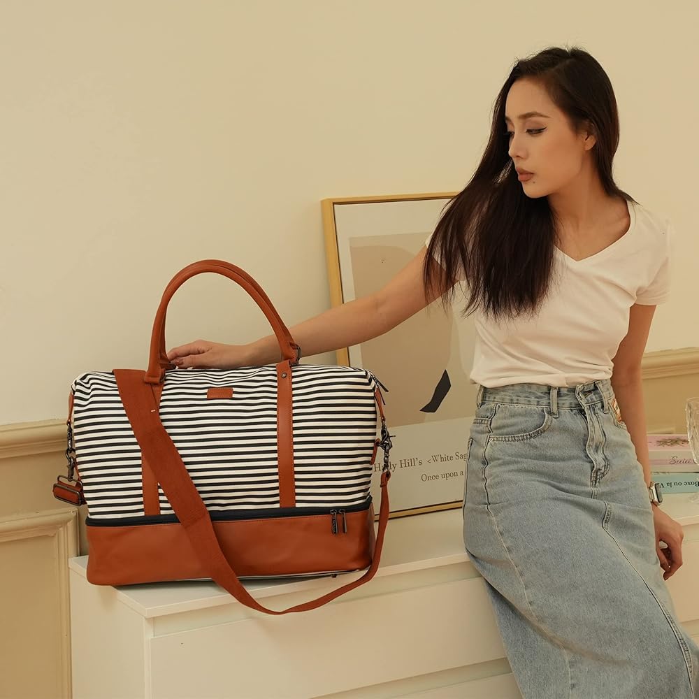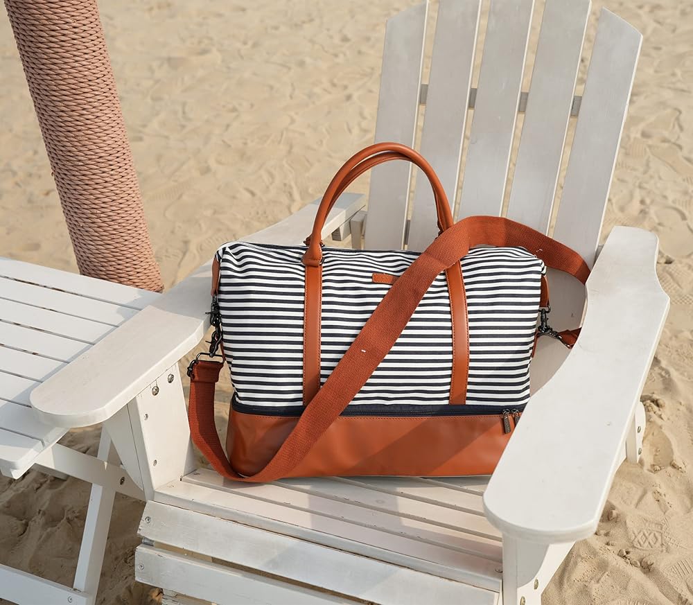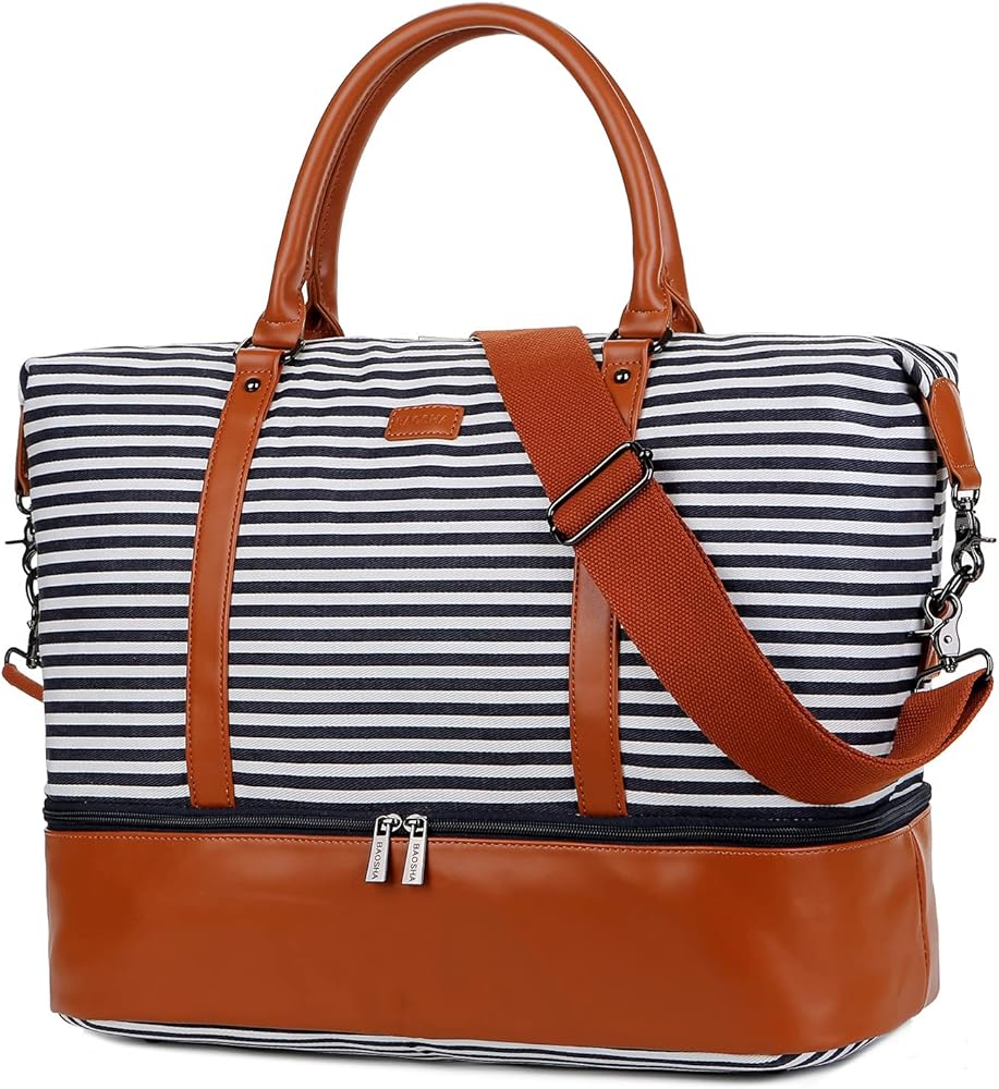 باوشا شنطة يد كبيرة توت قماشية للسفر وعطلة نهاية الاسبوع للنساء من اتش بي-28 (شرائط زرقاء مع جيب للحذاء)، ازرق، 16 × 12 × 8 انش، عصرية/ملائمة, أزرق, 16 x 12 x 8 inch