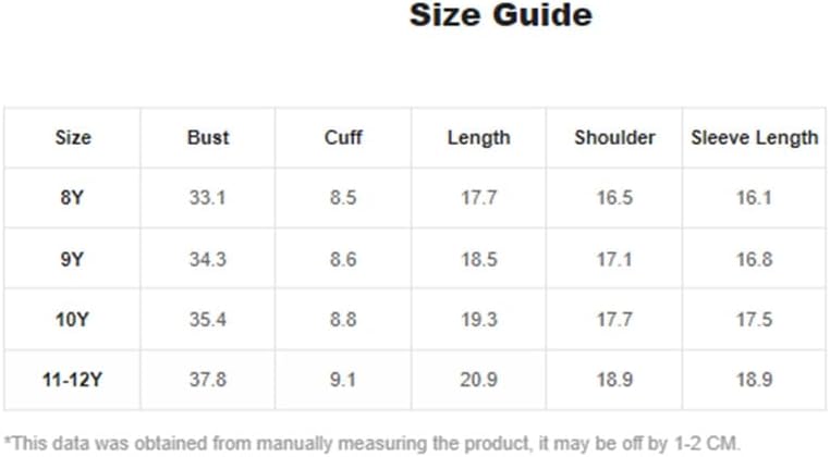 11-12 Years: Shoulder: 17.3", Length: 23.2", Sleeve Length: 19.6", Bust: 37.8", Cuff: 6.9", Bicep Length: 13.9"