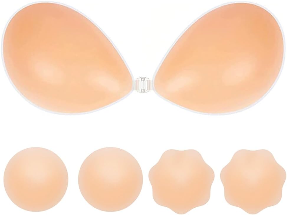 حمالة صدر لاصقة من FOME حمالة صدر غير مرئية، حمالة صدر لاصقة للنساء من السيليكون عصا على حمالة صدر رفع، حمالات صدر بدون حمالات للفستان مع زوجين من أغطية الحلمات (مقاس كوب B) بيج