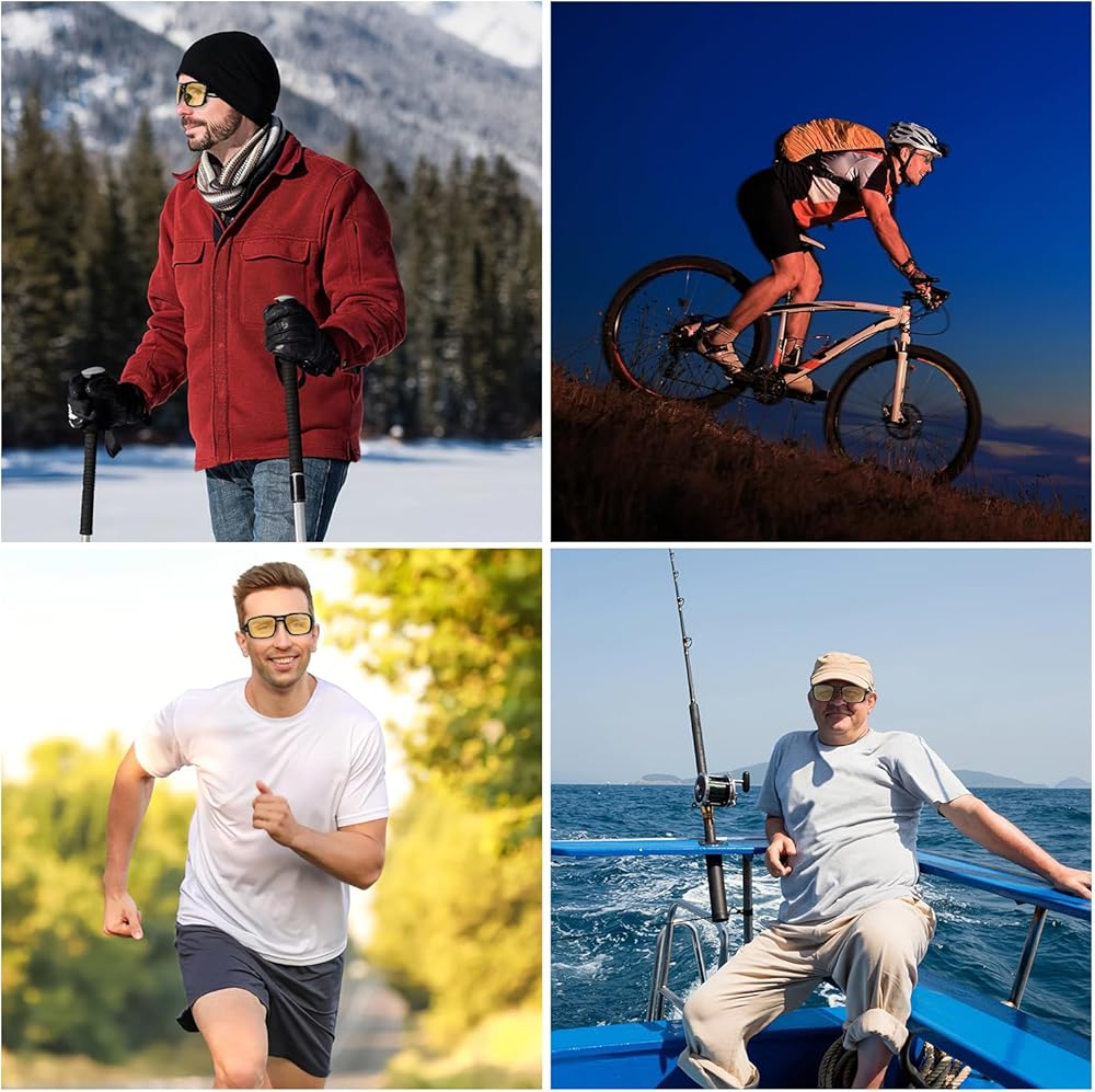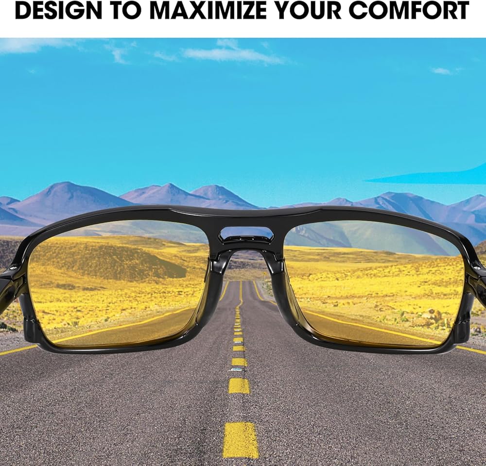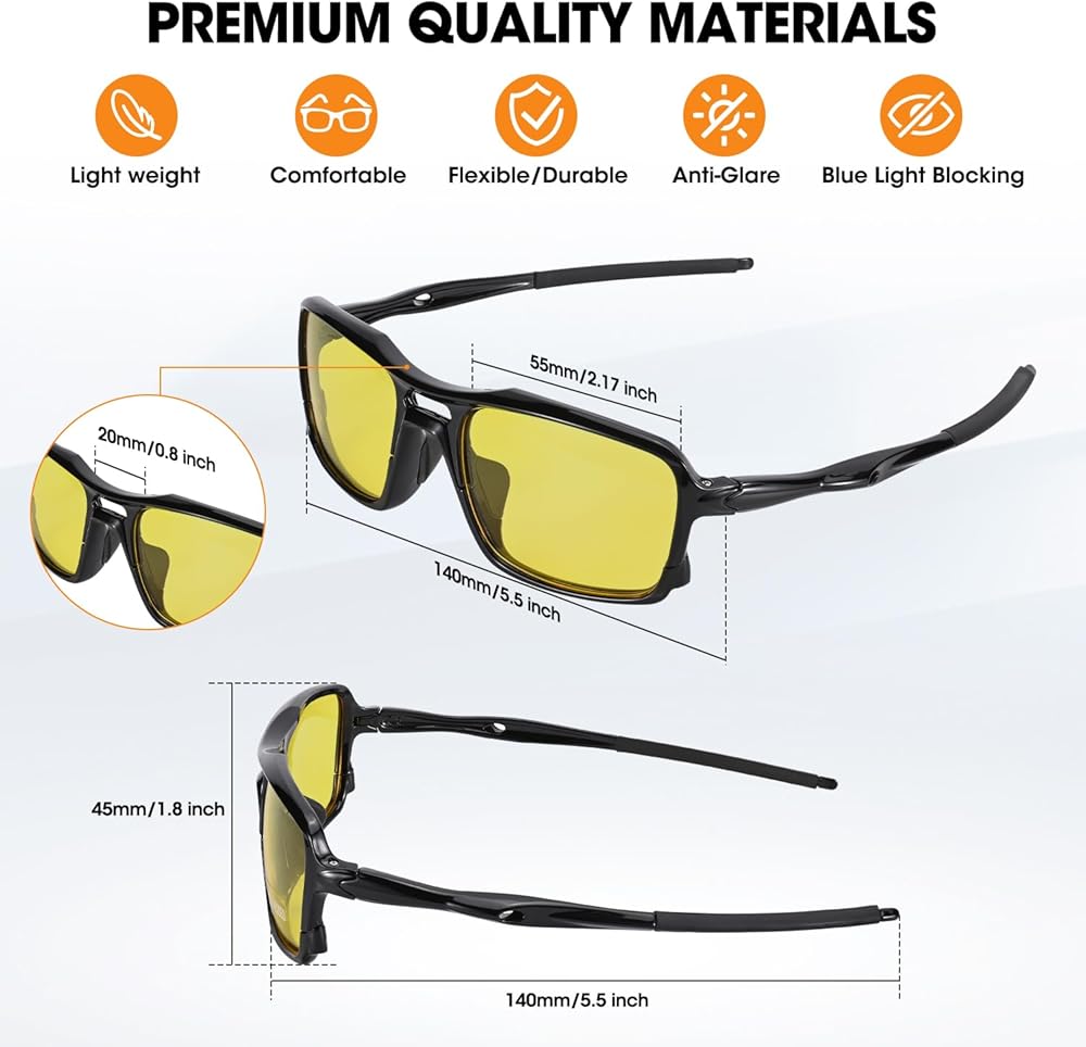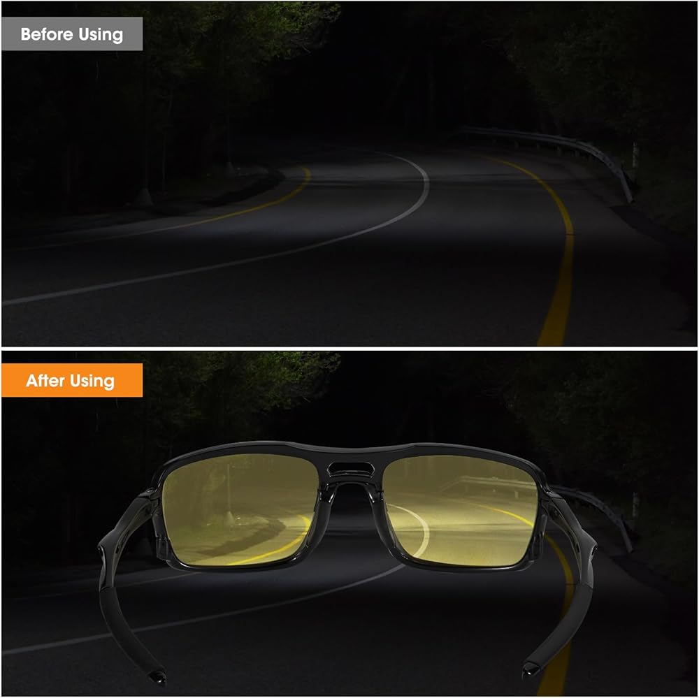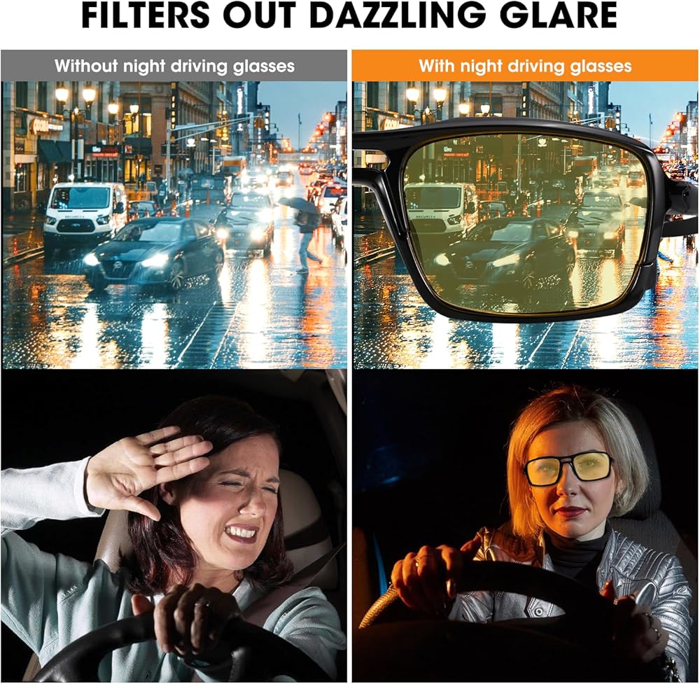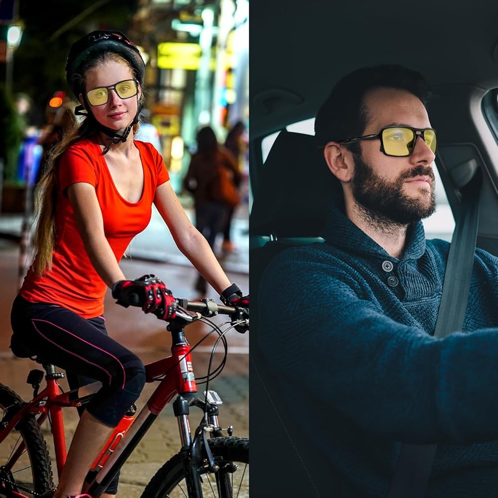 نظارات الرؤية الليلية للقيادة -- قيادة أكثر أمانًا في الليل والغروب عن طريق تقليل الوهج الناتج عن المصابيح الأمامية للسيارة ومصابيح الشوارع ومن الرصيف الرطب. يساعد على تقليل تأثير "الهالة" للضوء الساطع الناتج عن الاستجماتيزم، ويوصى به بشدة للاستخدام بعد جراحة الليزك