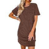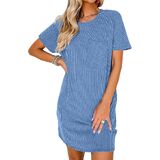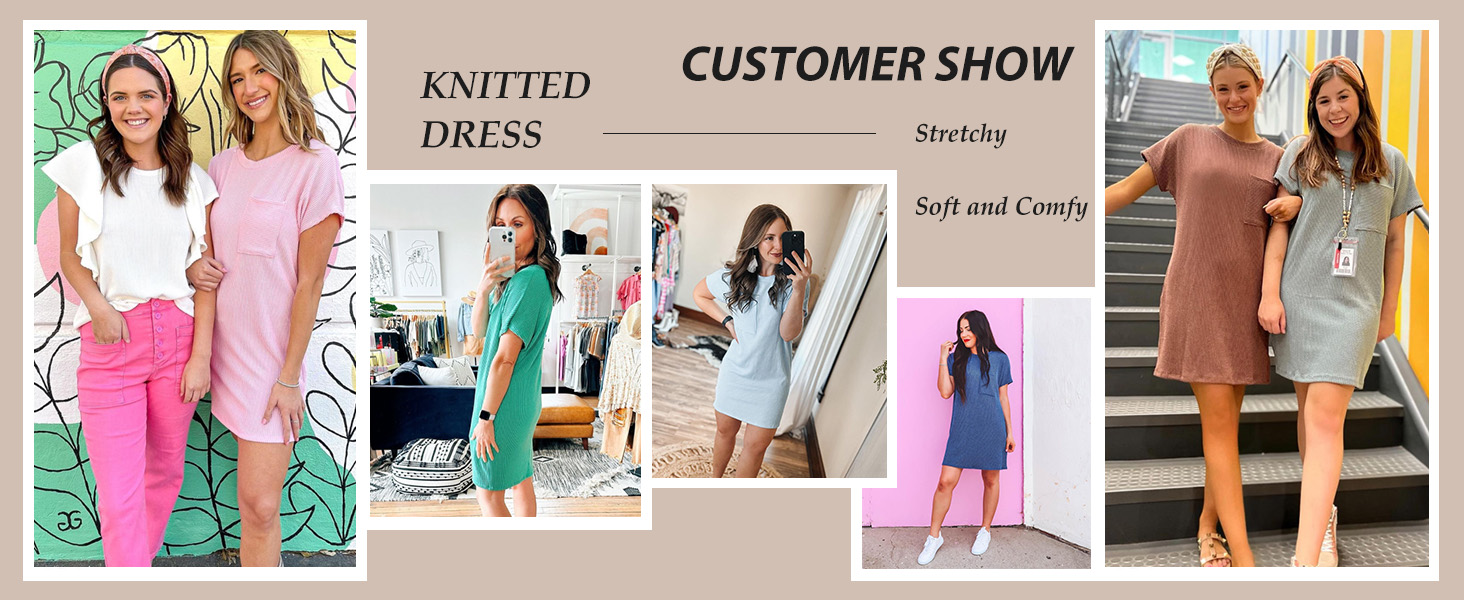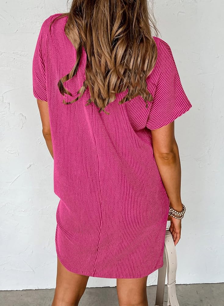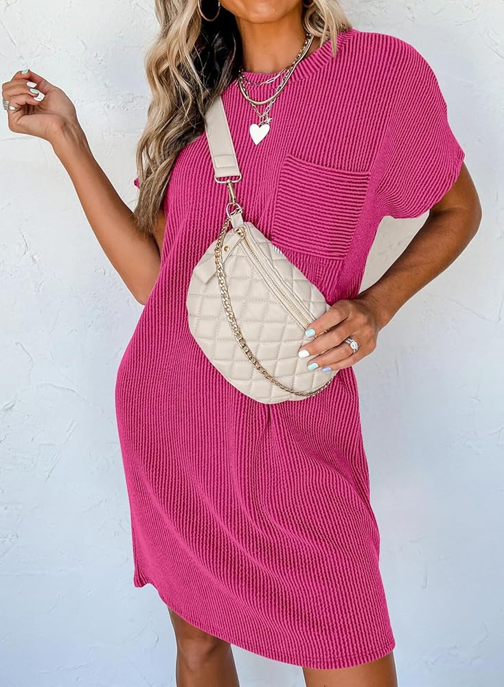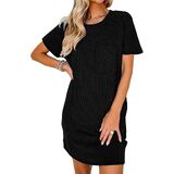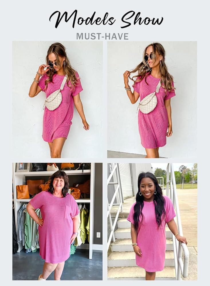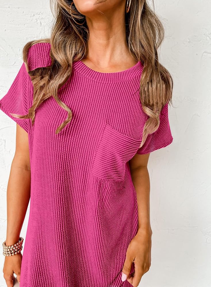 المميزات: يوفر هذا التي شيرت النسائي ذو الرقبة المستديرة مقاسًا فضفاضًا ومريحًا مع القدر المناسب من المرونة، مما يسمح بسهولة الحركة. مع الطول الذي يصل إلى الركبة، يضيف النسيج المضلع لمسة عصرية، وجيب الصدر سهل الاستخدام لا يضيف الوظيفة فحسب، بل يعزز أيضًا مظهر الفستان. هذا الفستان الكاجوال على شكل تي شيرت مناسب أيضًا لأشكال الجسم المختلفة، ويمكن للنساء الحوامل أيضًا ارتدائه بسهولة