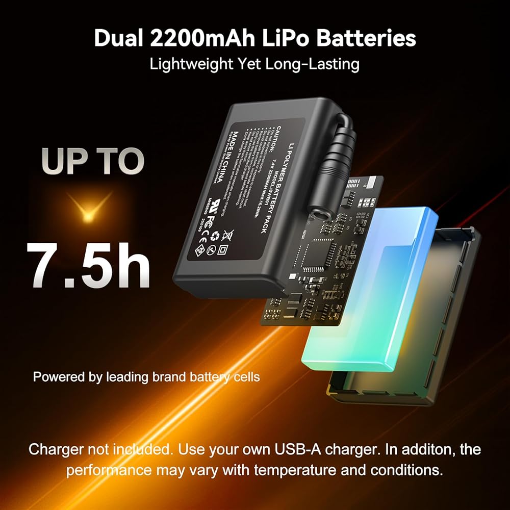 【سعة بطارية كبيرة، وقت أطول يدوم】قطعتان 7.4 فولت 2200 مللي أمبير في الساعة، بطاريات ليثيوم أيون قابلة لإعادة الشحن، تدوم لفترة أطول. تم تصميم 7.4 فولت لتكون أكثر استقرارًا من 5 فولت/3.7 فولت، وتتمتع بطاريات 7.4 فولت لدينا بأداء أفضل وطاقة أعلى في درجات الحرارة المنخفضة. يسخن الجزء الداخلي من حذاء الثلج الساخن بشكل أسرع في درجات الحرارة الباردة، وفي الوضع المنخفض والمشحون بالكامل يستمر في التسخين مما يوفر ما يصل إلى 7 ساعات من الدفء. تحتاج إلى بطاريات احتياطية، يرجى البحث عن الرقم التعريفي القياسي ASIN: B07NXT5XQP.