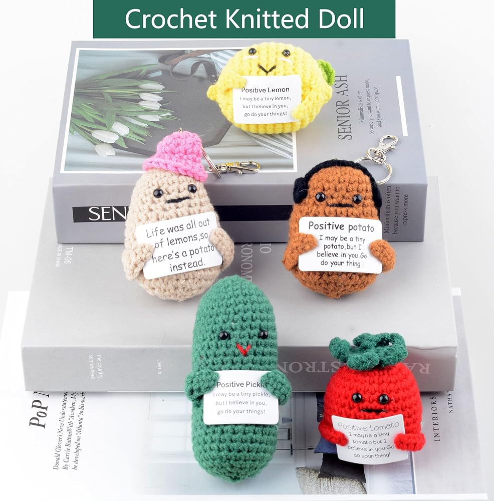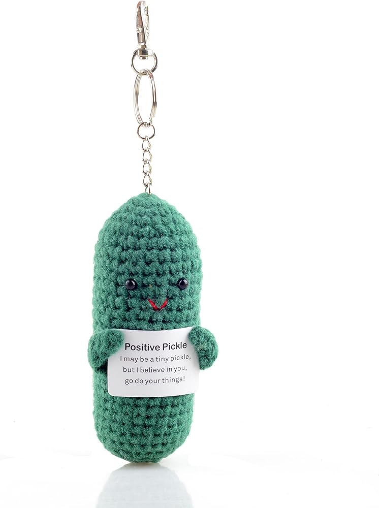 WHAT YOU WILL GET: You will receive a knitted positive Cucumber Pickle , a keychains, and and a card with the encouraging words'Positive Pickle I may be a tiny pickle ,but I believe in you.Go do your thing!'which is glued to the positive pickle doll.