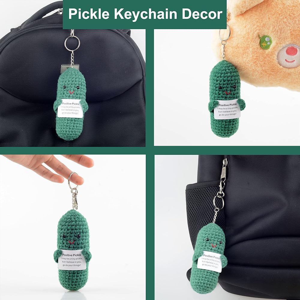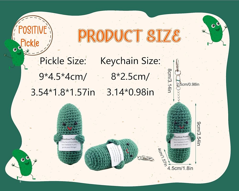 FUNNY MINI PICKLE: This is a very cute and funny Positive pickle knitted doll, its size is 9*4.5*4CM/3.54*1.8*1.57INCH .This mini pickle can be hung on a keychain, which makes it a very ideal inspirational gift.