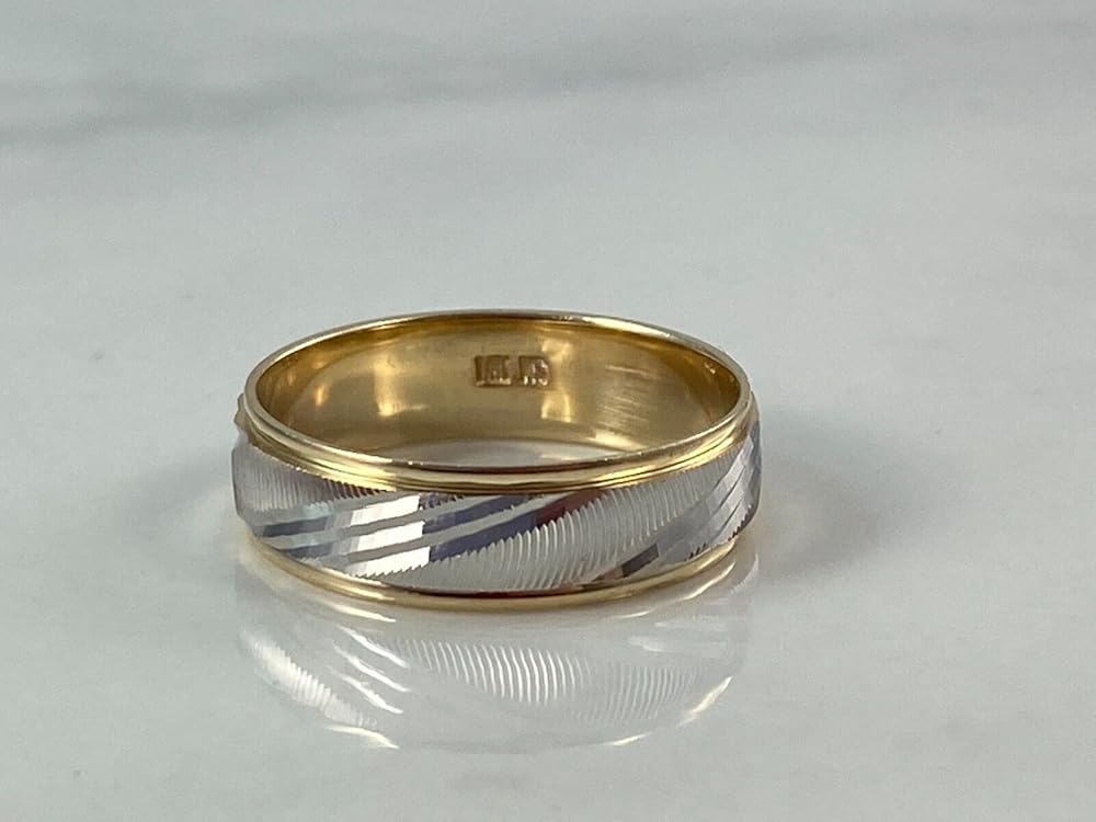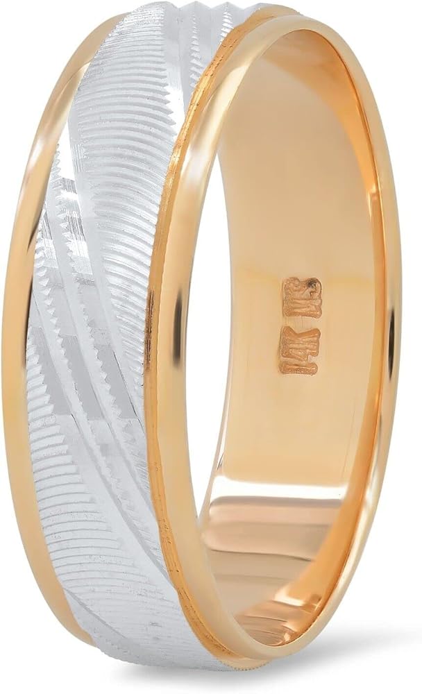 14K solid yellow and white two tone gold mens or womens unisex comfort fit ring wedding band, beautifully crafted in a laser diamond cut slant design with a high polish finish. The ring is available standard in sizes 5 through 13 but contact us for additional sizes. The band is 6.0 mm wide with a total weight of 3.5 to 4.5 grams depending on the size. The bands are stamped "14K". Rings are made in Los Angeles.