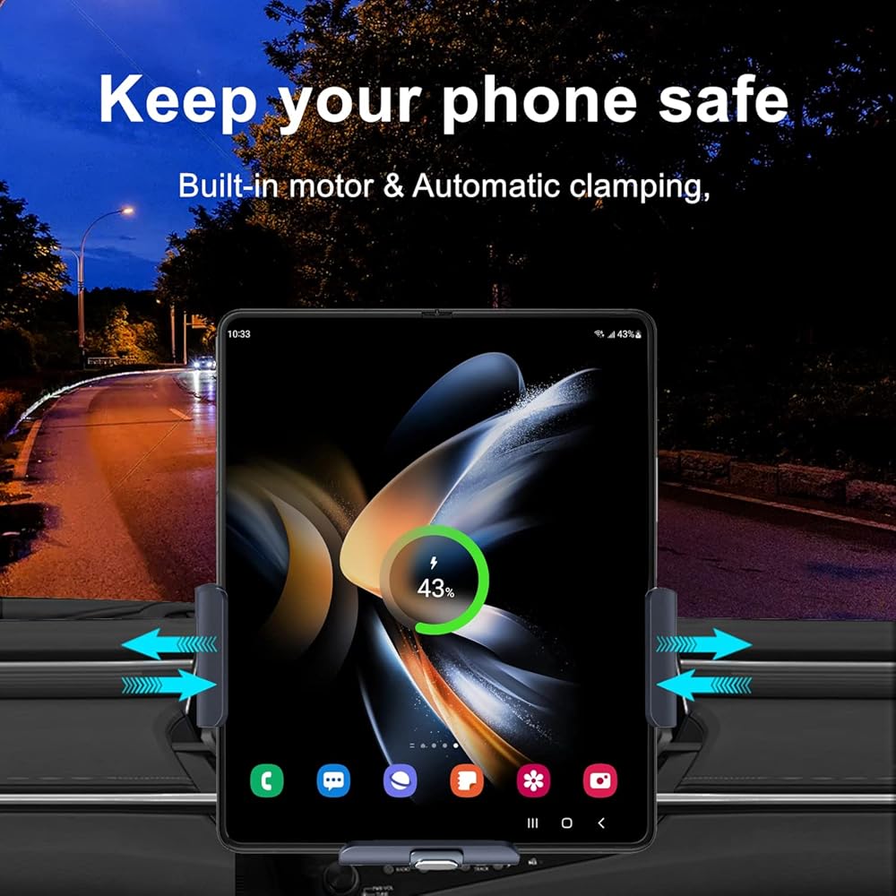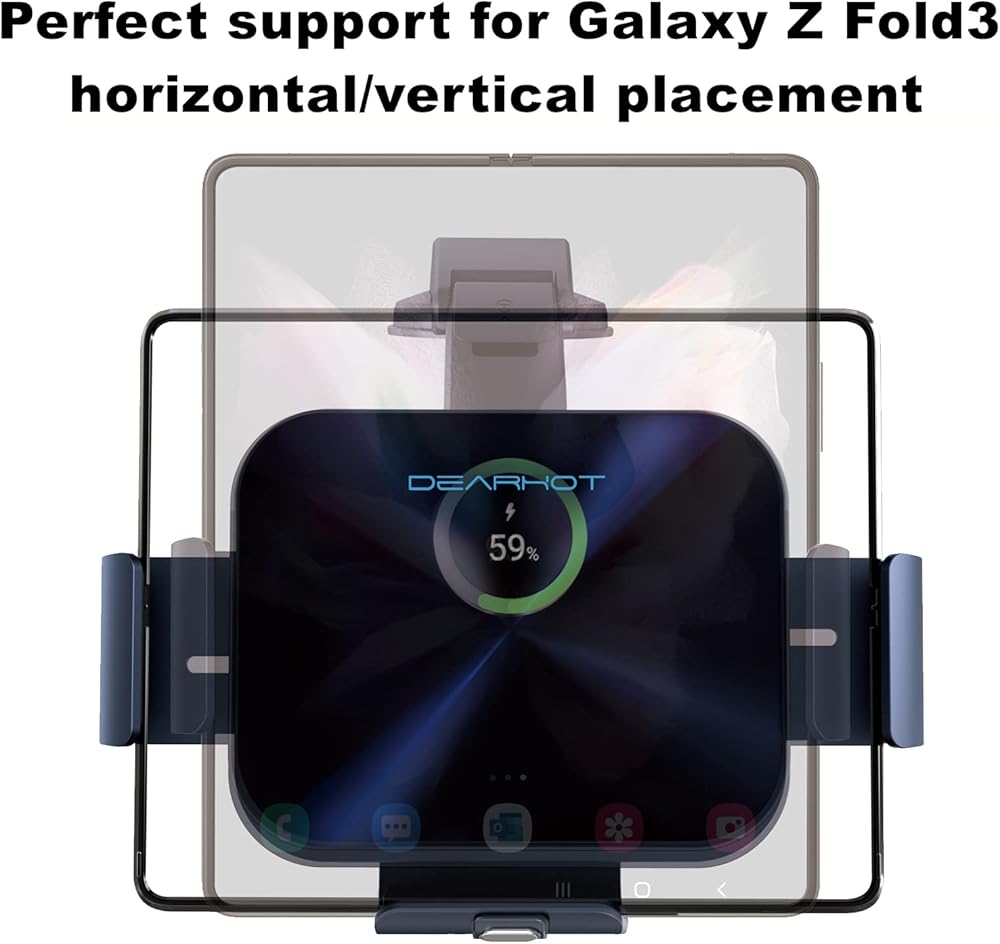 مشبك الحث التلقائي الذكي: اضغط على الزر الموجود على الجسم، وسيقوم حامل الهاتف بتحرير المشبك، بعد وضع الهاتف، سيقوم حامل الهاتف تلقائيًا بالمشبك ويبدأ الشحن. اضغط على الزر، وسيقوم المشبك بتحرير هاتفك تلقائيًا، ويمكنك الحصول على الهاتف. يمكن للمشابك العريضة جدًا أن تحمل هاتف Samsung Galaxy Z Fold4 / Fold3 بإحكام.