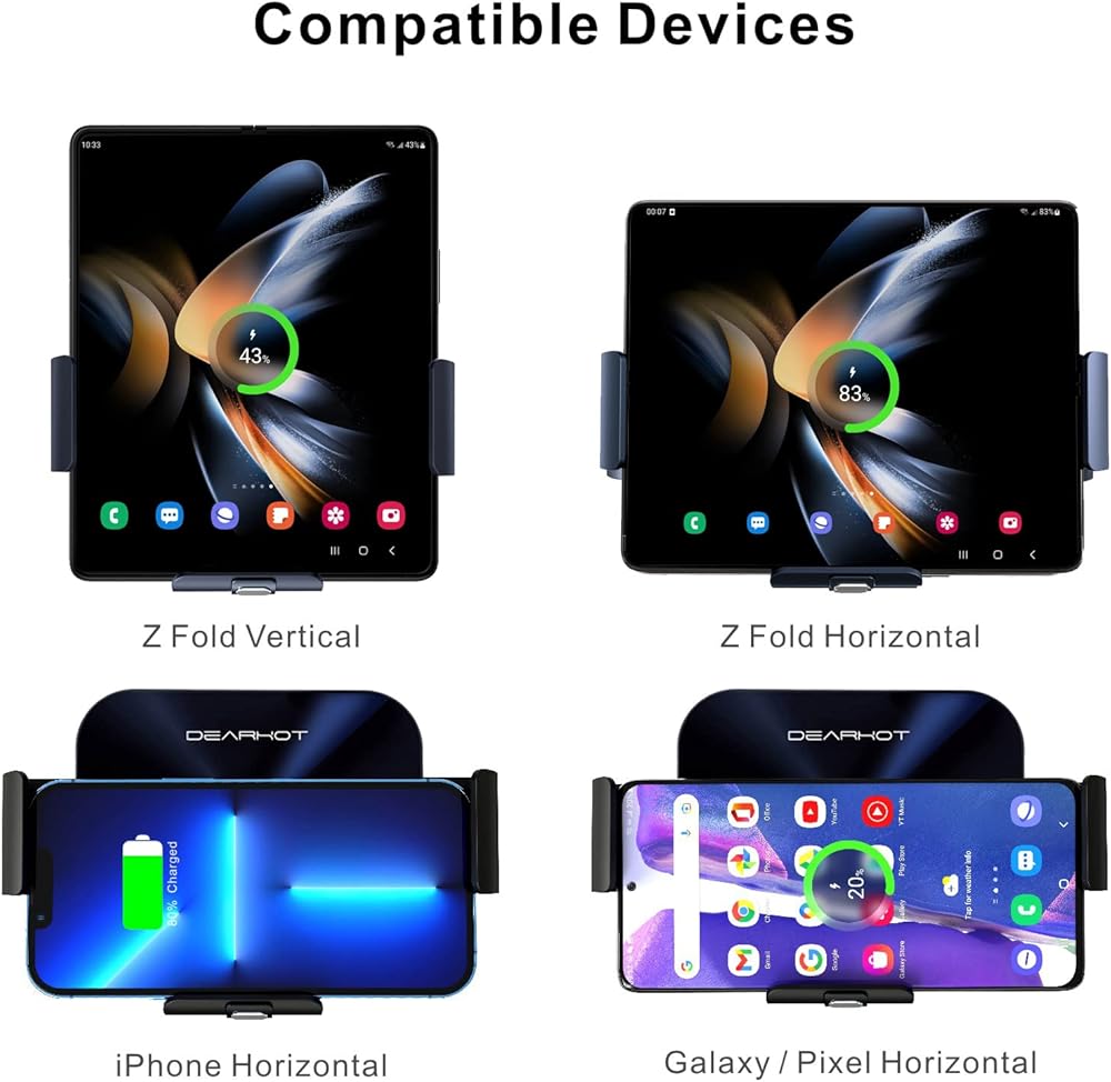 DearHot 15W Dual Coil Qi Wireless شاحن سيارة حامل مرآة متوافق مع Samsung Galaxy Z Fold4 Fold3 Z Fold2 Fold S22 Ultra Note20 iPhone 14 Pro Max Pixel 6 Pro Auto Clamp شاحن سيارة سريع