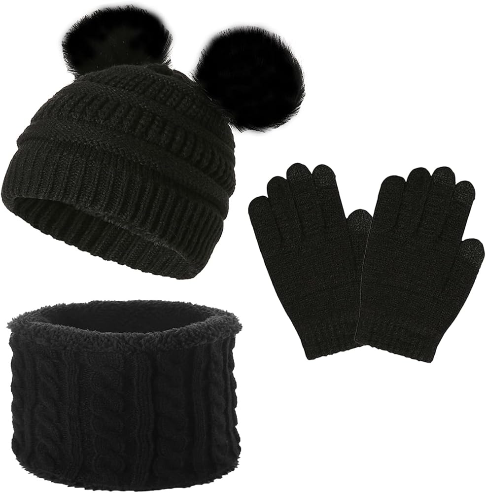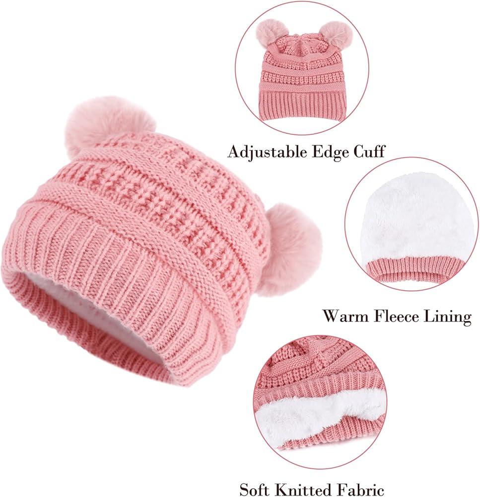 【خامة عالية الجودة】مجموعة قبعة صغيرة محبوكة دافئة للأولاد والبنات تتميز بتصميم سميك بطبقة مزدوجة، السطح مصنوع من نسيج أكريليك محبوك مرن عالي الجودة، مع غرز دقيقة؛ مبطن بملمس صوف سميك منتفخ وحراري، ناعم ومريح، لن يضر بشرة طفلك، ويمنح طفلك تجربة ارتداء جيدة.