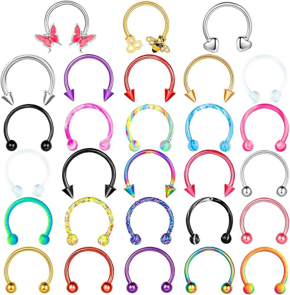 28 قطعة من حلقات الحاجز الانفي 16 غرام للنساء من اوغفو، اقراط ثقب الانف والشفاه، مجوهرات ثقب الانف على شكل حدوة حصان، اقراط لا تسبب الحساسية من الستانلس ستيل 10 ملم، ستانلس ستيل، زركونيا مكعب, ستانلس