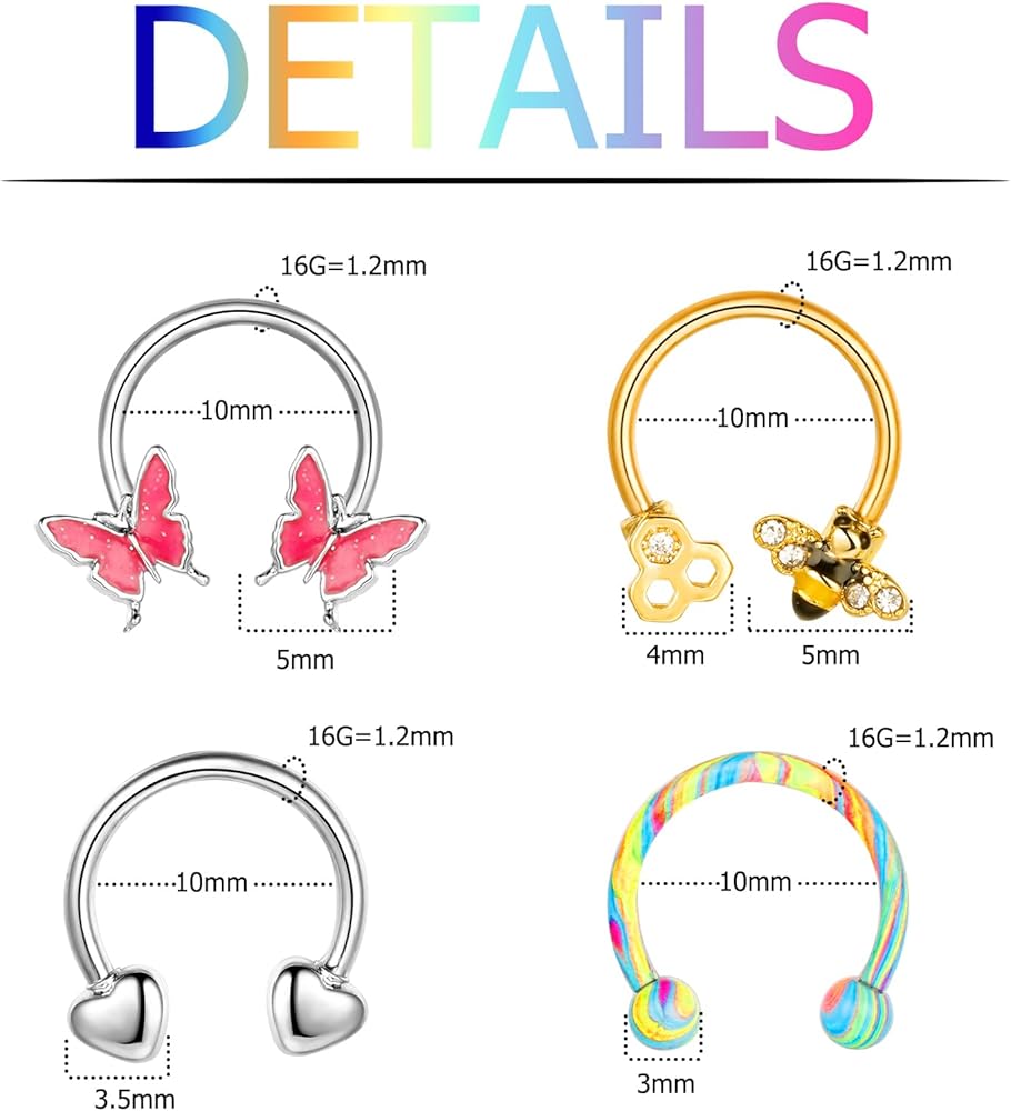 المقاس - مقاس حلقات الأنف على شكل حدوة حصان للنساء هو: القطر الداخلي لقضيب الأثقال على شكل حدوة حصان 10 ملم، مقاس الكرة والمسامير 3 ملم. هذا المقاس مناسب لمعظم محبي ارتداء مجوهرات ثقب الحاجز الأنفي.