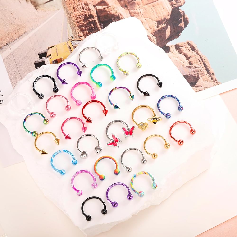 28 قطعة من حلقات حاجز الأنف - إجمالي 28 قطعة من مجوهرات ثقب الحاجز الملونة مع صندوق هدايا بلاستيكي شفاف صغير. هناك أنماط متعددة من حلقات الحاجز الأنفي بوزن 16 غرام، بما في ذلك حلقات الحاجز الأنفي على شكل حدوة حصان وحلقة أنف على شكل حدوة حصان وحلقات دائرية من الستانلس ستيل وحلقات الشفاه وما إلى ذلك.