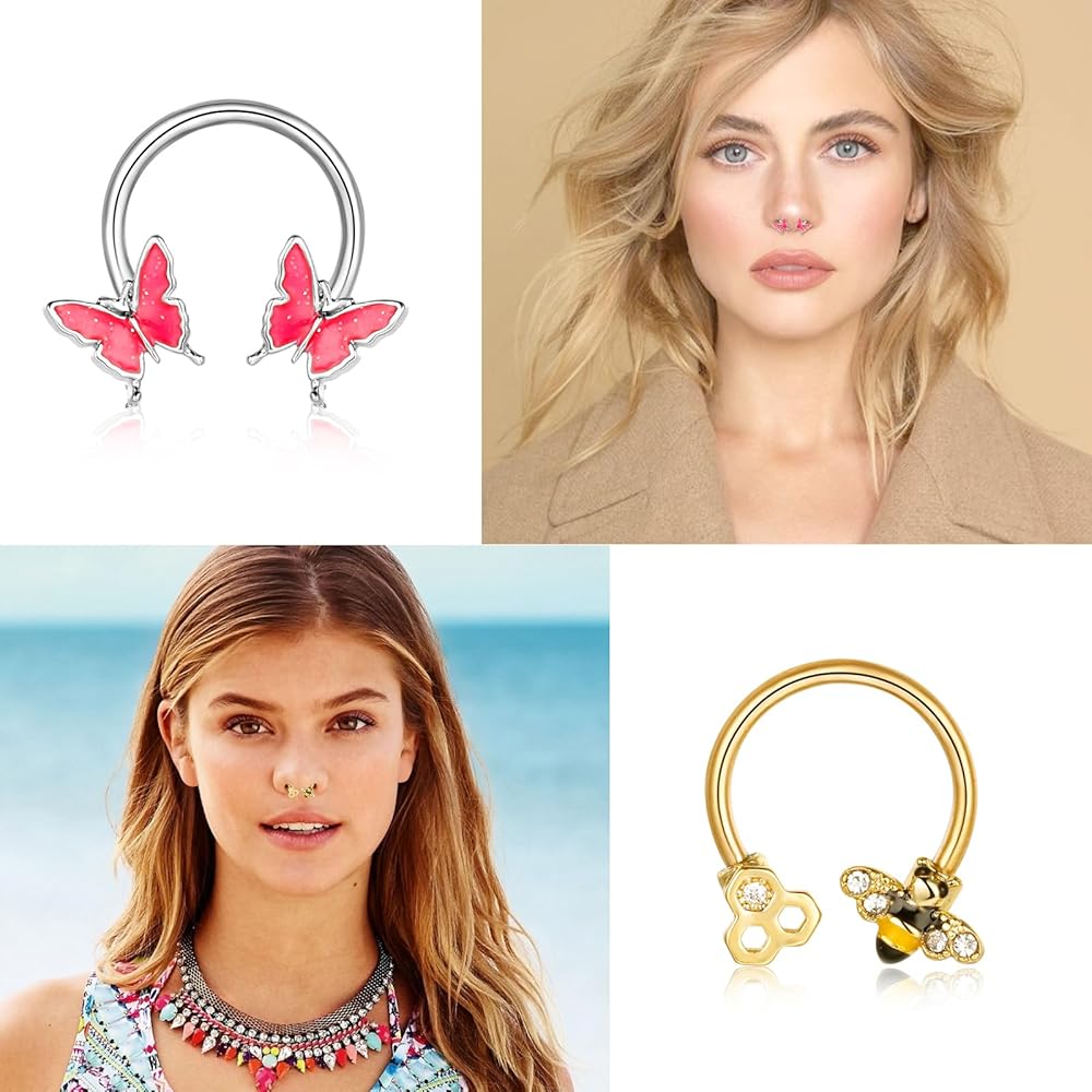 المادة - مجوهرات حاجز الأنف هذه بوزن 16 غرام مصنوعة من الستانلس ستيل عالي الجودة بحرفية مصقولة، سطح أملس، لا تسبب الحساسية، خالية من الرصاص والنيكل، ويمكن ارتداؤها وخلعها بسهولة.