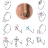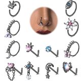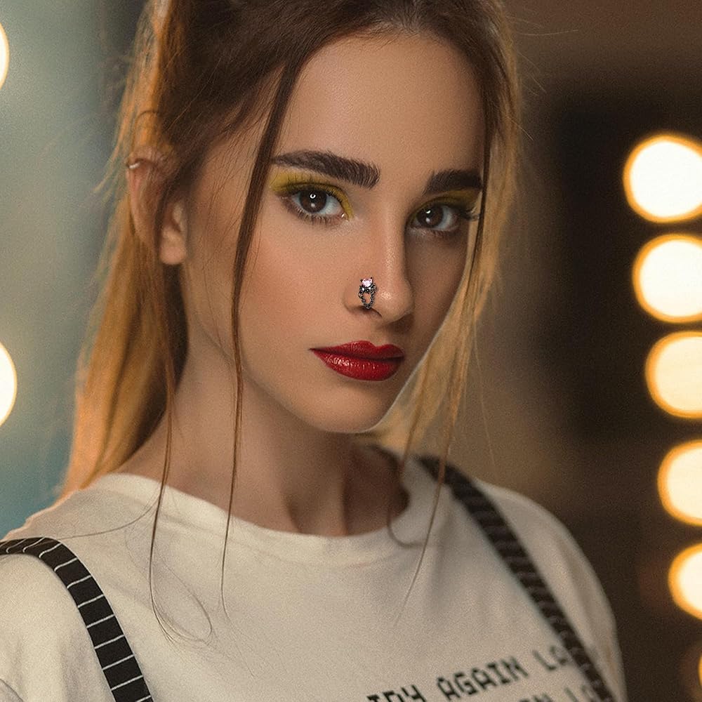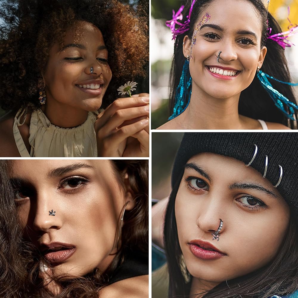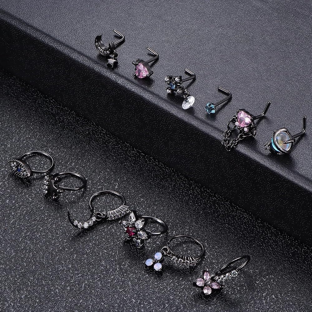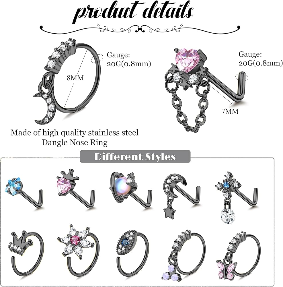 • 💎𝐃𝐚𝐧𝐠𝐥𝐞 𝐍𝐨𝐬𝐞 𝐑𝐢𝐧𝐠𝐬💎: 12 قطعة من مسامير الأنف الأنيقة على شكل حرف L وأطواق الأنف في مجموعة واحدة، بما في ذلك 6 قطع من حلقات الأنف المتدلية الفريدة و6 قطع من حلقات الأنف ذات التصميم التقليدي، مزينة بالزركونيا المكعبة الملونة اللامعة. حجر القمر، يضيف إحساسًا بالأناقة إلى ملابسك مما يجعلها إكسسوارًا مثاليًا للأزياء.