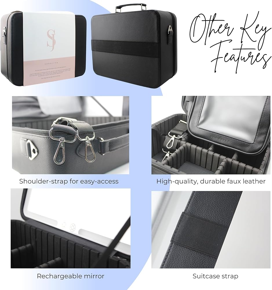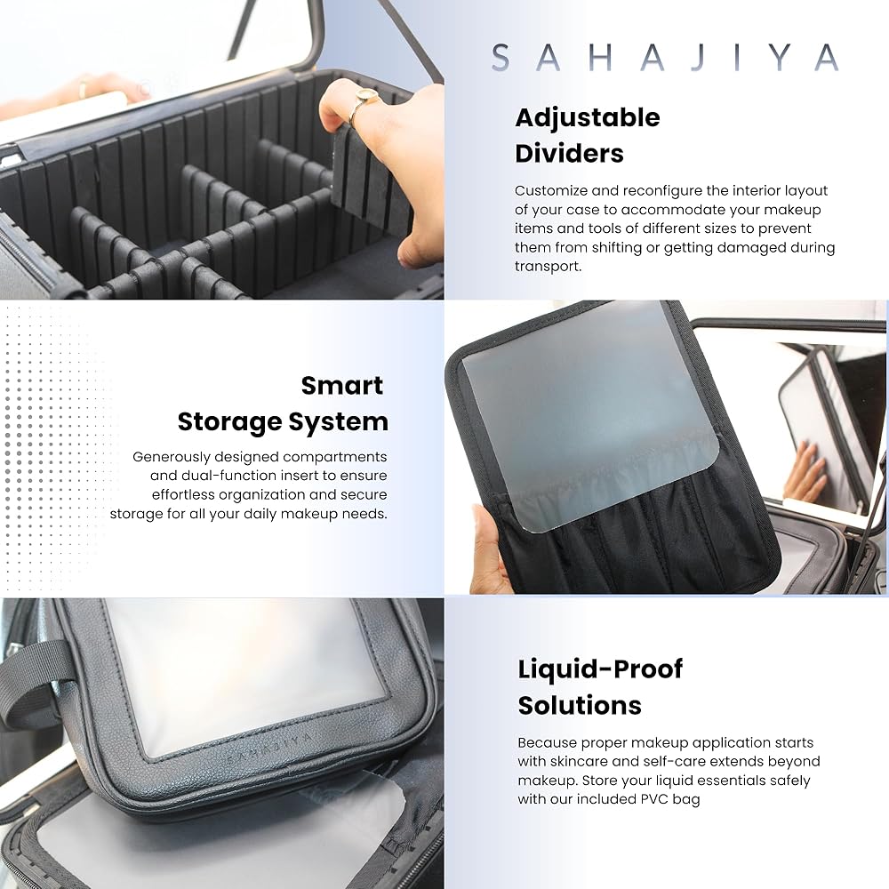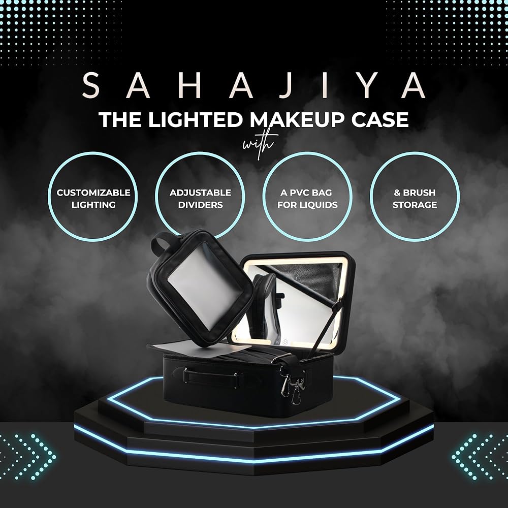 شنطة مكياج من ساهاجيا مع مراة مضيئة ودروس تدريب حية، شنطة مكياج سوداء انيقة، شنطة تنظيم مكياج محمولة ومناسبة للسفر مع فواصل قابلة للتعديل - منظم مراة LED