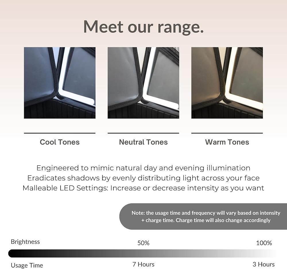 مرآة مدمجة مع 3 إعدادات للإضاءة: تأتي حقيبة المكياج مع مرآة مدمجة و3 إعدادات إضاءة قابلة للتعديل، مما يسمح لك بوضع مكياجك بسهولة في أي ظروف إضاءة.