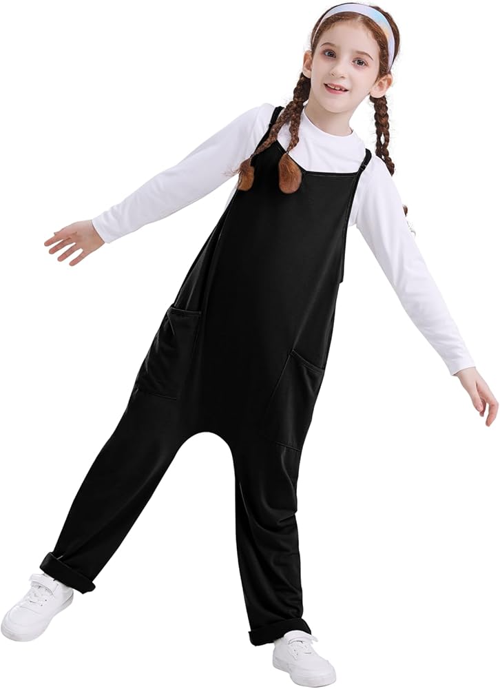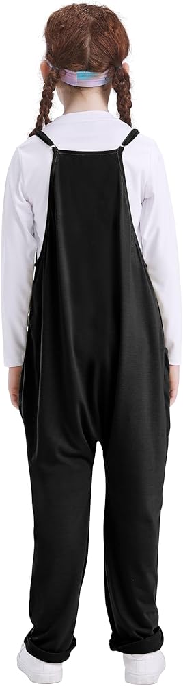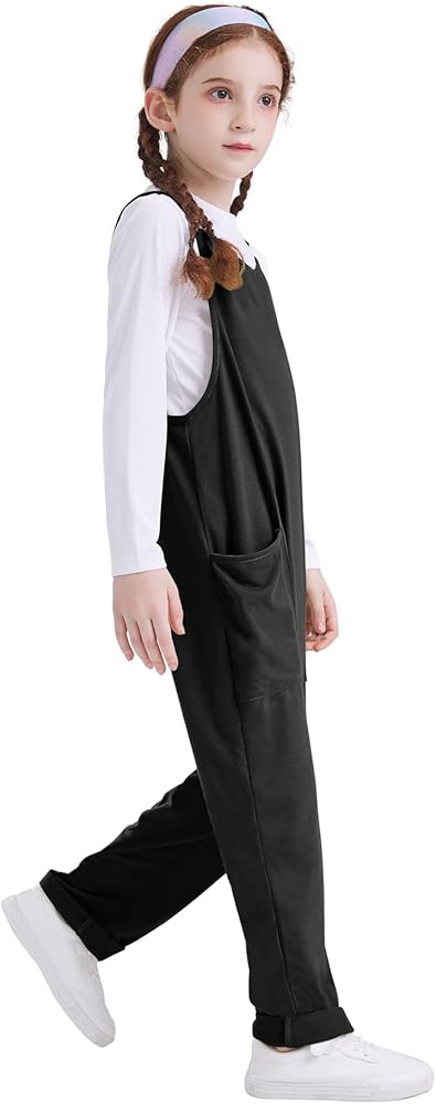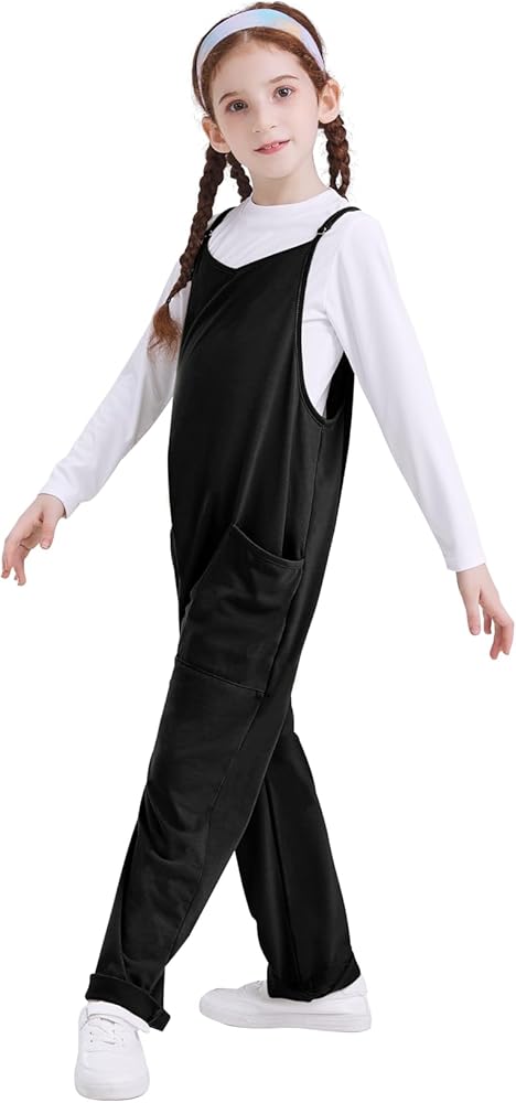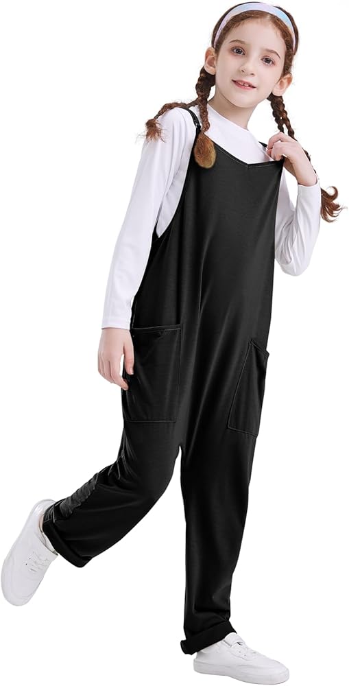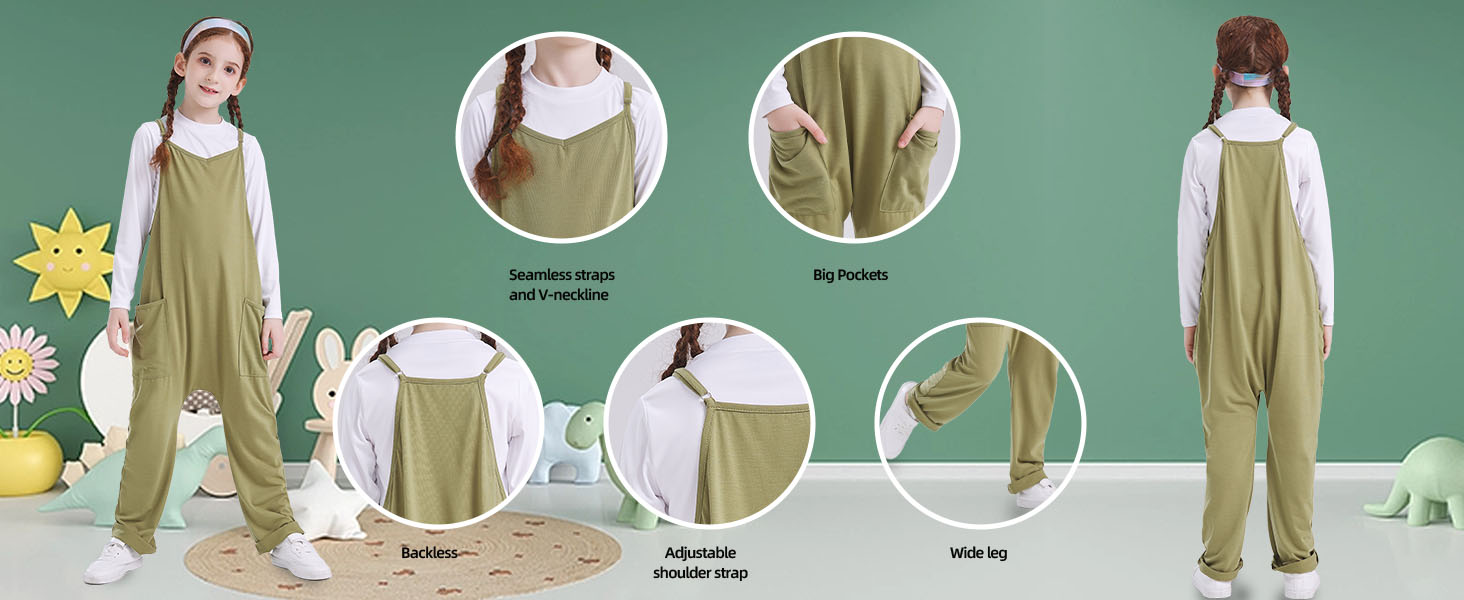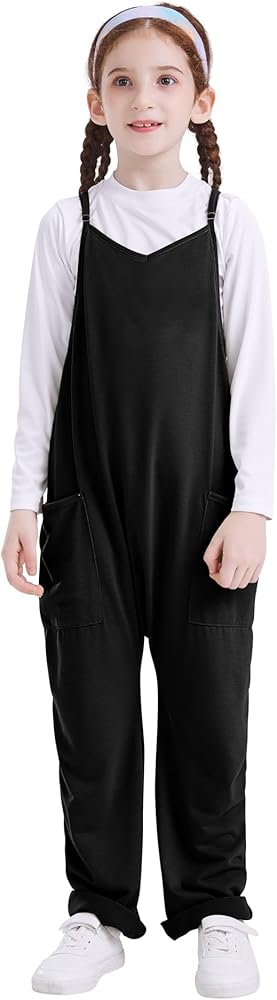 【Unique Design】-This soft, comfy and loose design with a dropped crotch and convenient side big pockets, casual sleeveless jumpsuit with spaghetti strap, V-neck neck, solid color jumpsuits for kids.