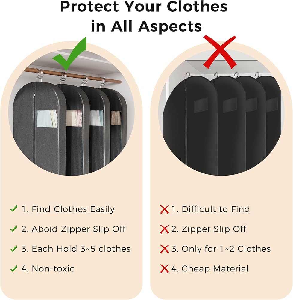 【Visible Design】: Each hanging garment bag includes a large transparent viewing window, users easily identify the inside clothes without opening the suit bag. This garment storage bags can prevent clothes from wrinkling and make your wardrobe more tidy and comfortable.