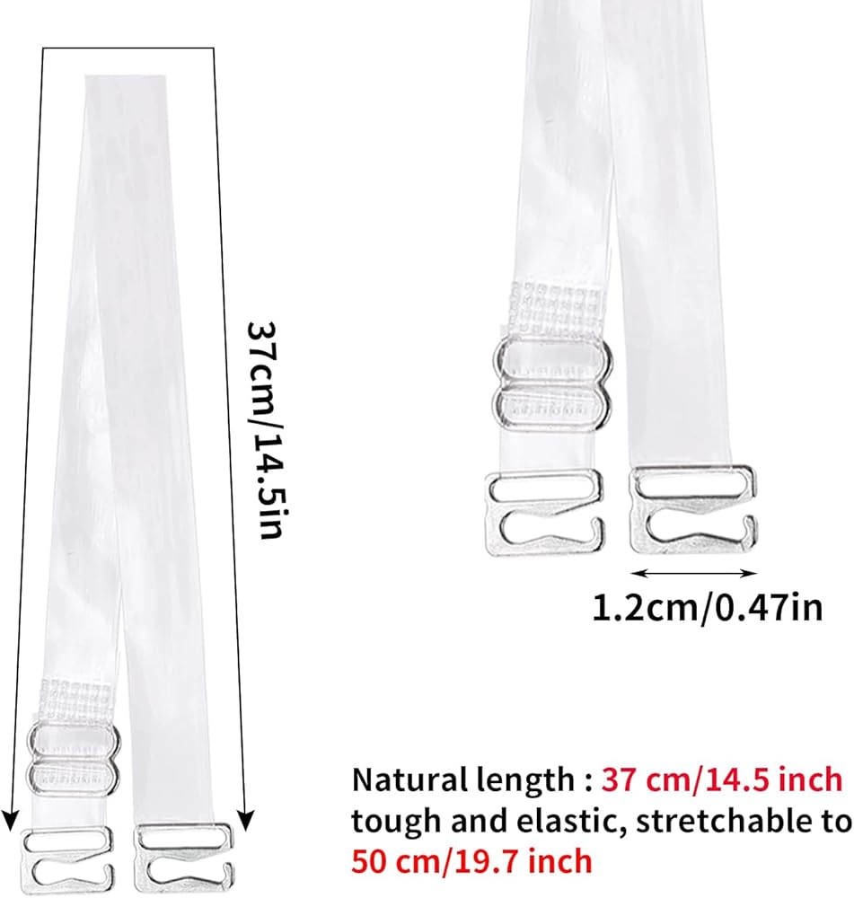 -- Package List : 4 pairs of clear chest straps with metal hooks. Sheer bust measures 1.2cm wide. The length is 14.5 inches / 37 cm (the metal buckle can adjust the length of the shoulder strap).