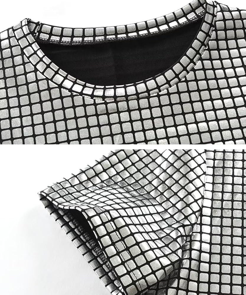 • 【الميزات: تي شيرت برقبة دائرية، كم قصير، لامع، مناسب. تصميم جذاب مع لمسة نهائية معدنية فضية أو ذهبية لامعة. تضيف هذه التصميمات الفريدة سحرًا إلى زي الديسكو هذا في السبعينيات.